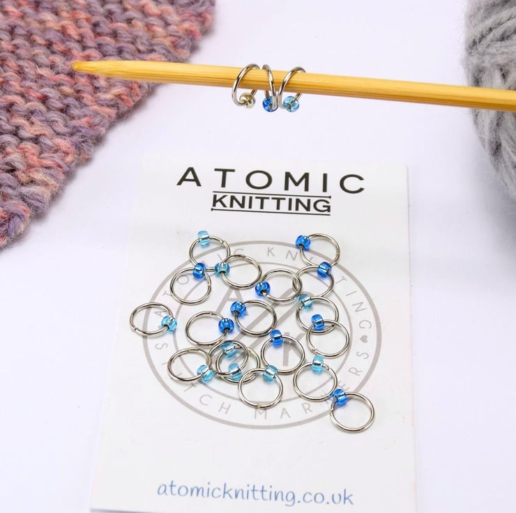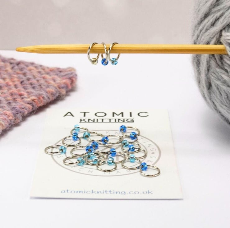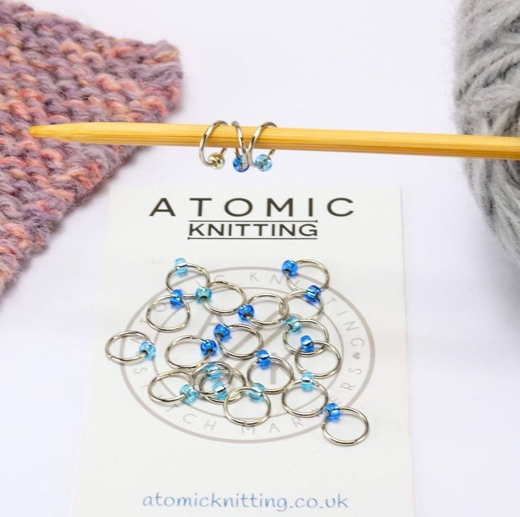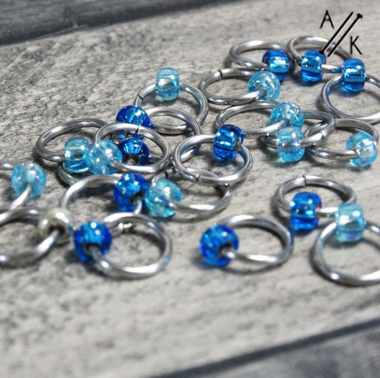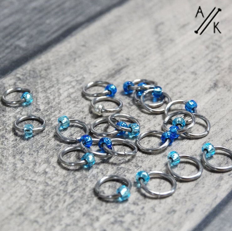 Set of 21 beaded split ring stitch markers for knitting. Each pack contains 10 x aqua and 10 x blue silver lined glass beaded stitch markers & 1 x silver beaded stitch marker. With tiny beads for a minimal stitch marker set.