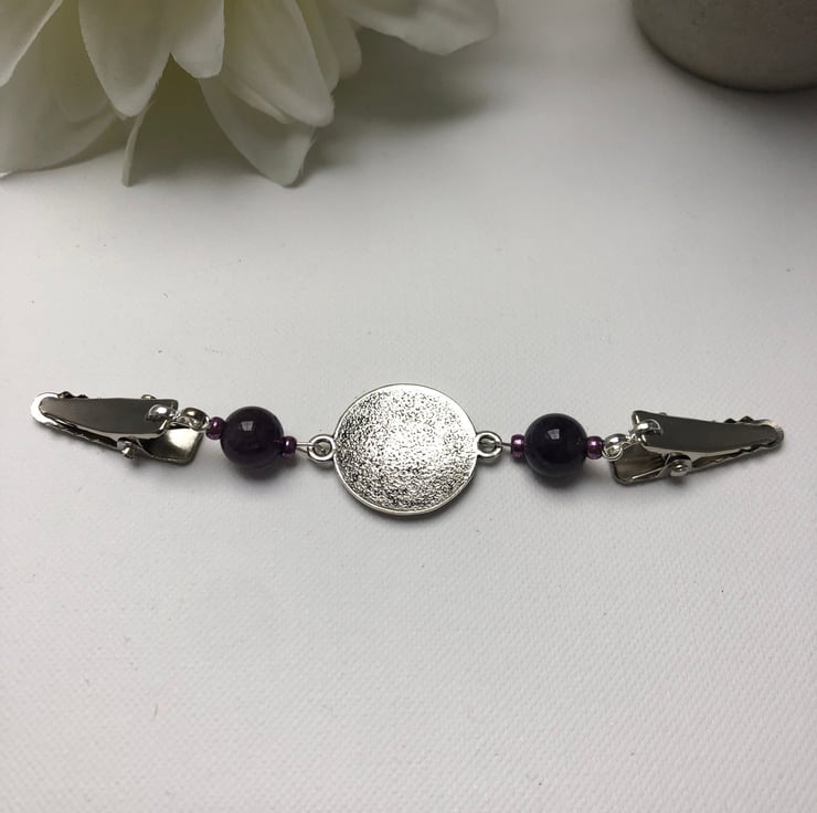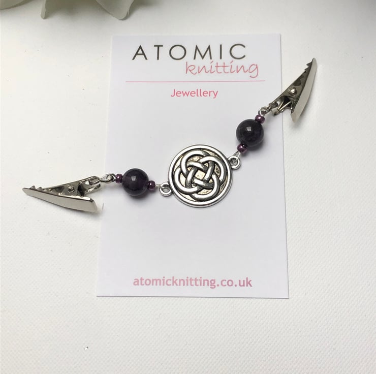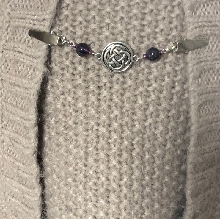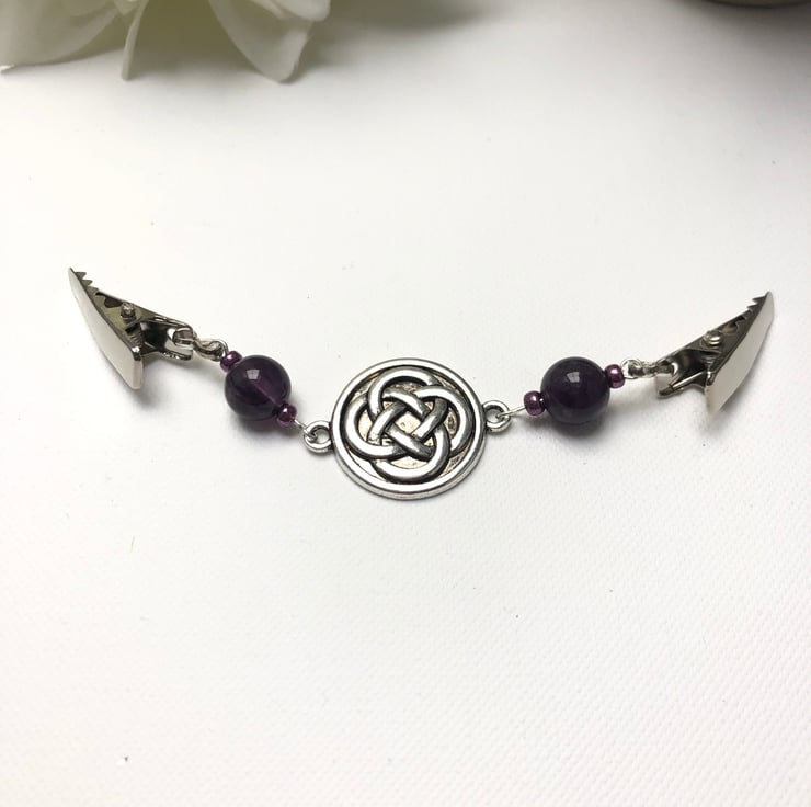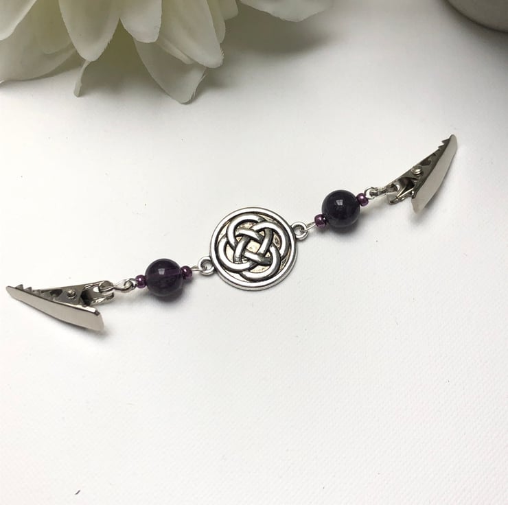 Cardigan clip with Amethyst gemstones either side of a single sided Celtic knot pendant with silver colour clips. Finished with tiny metallic seed beads for a contemporary look.