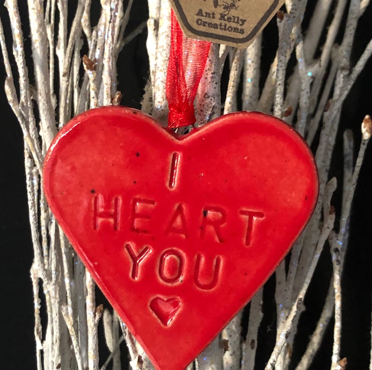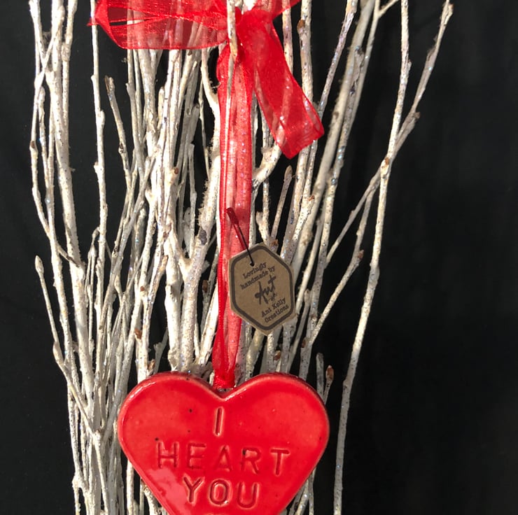 Glossy glazed red heart hanging decoration with stamped text I HEART YOU with a small stamped heart.