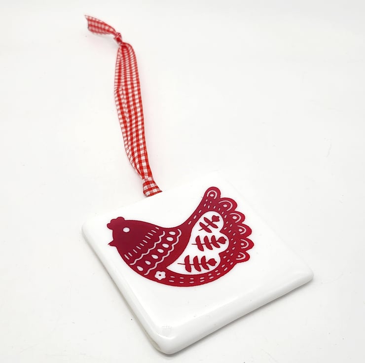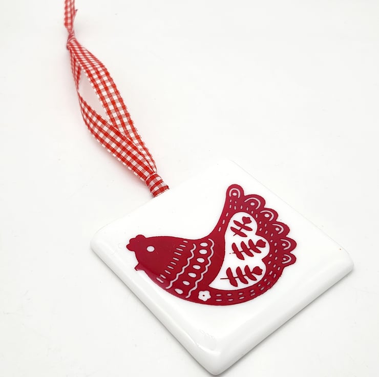 Fused glass folk art hen decoration on red checked ribbon. Scandinavian style, suitable for Christmas tree decoration or kitchen hanging decoration, measures 7 cm x 7 cm. Silkscreen image in red enamel on a white fused glass background. As each one is handmade there maybe slight variations.