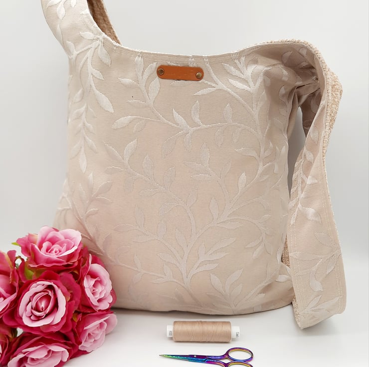 Measures 13" in width and 12" in depth. The long handle measures 10" from the rim of the bag and is designed to be pulled through the small handle for fastening.
