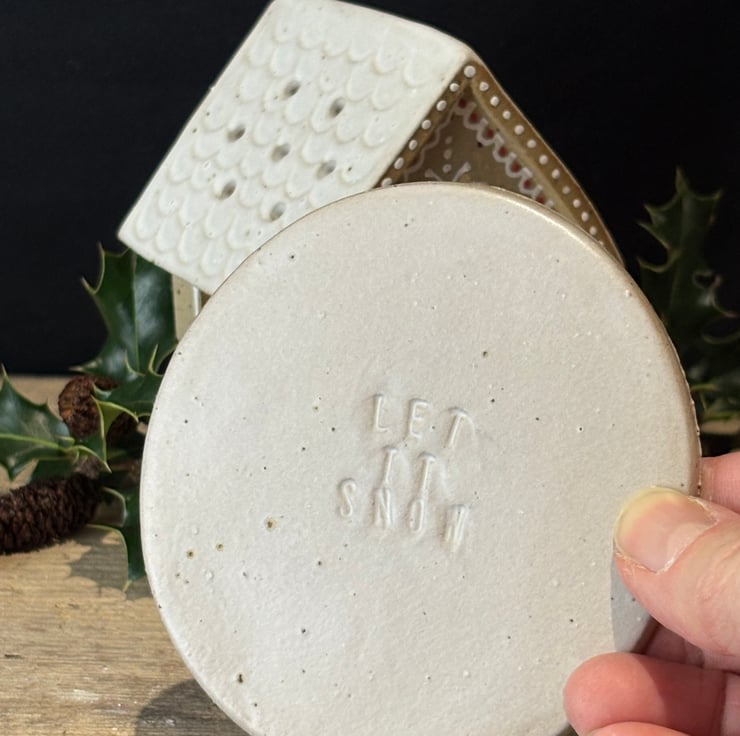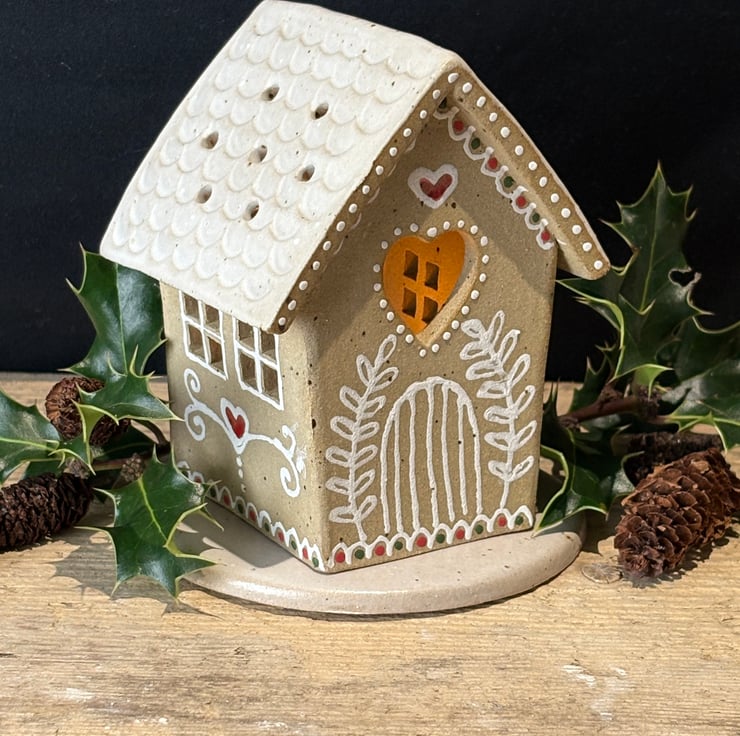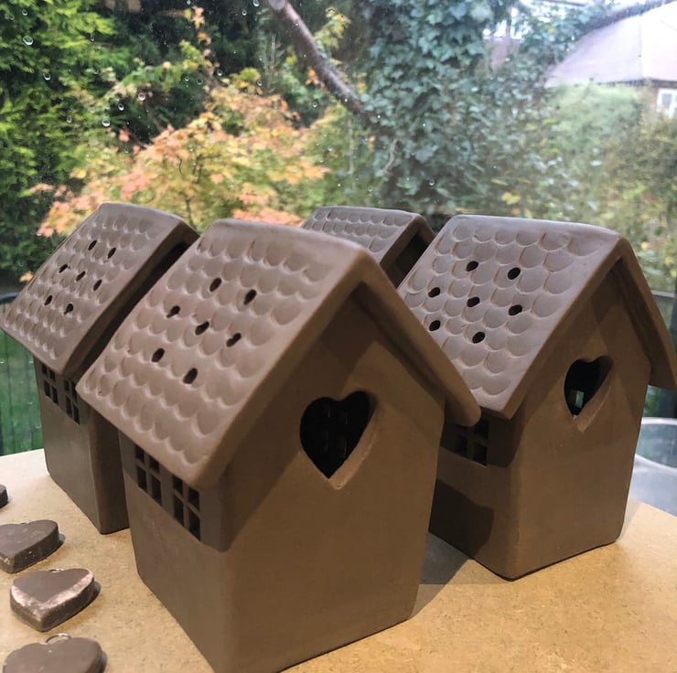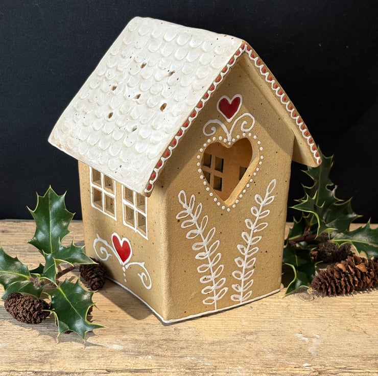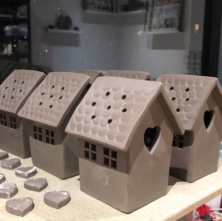 Made from stoneware clay and decorated with a textured roof with drilled holes and cut out window shapes. The front and back of the house has a cut out heart shapes - all let the flicker and glow of a tea-light shine through.