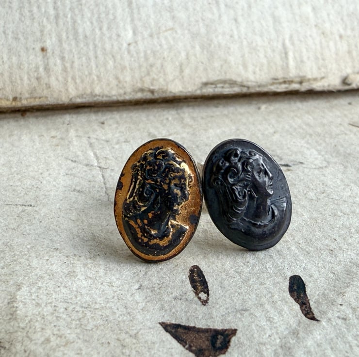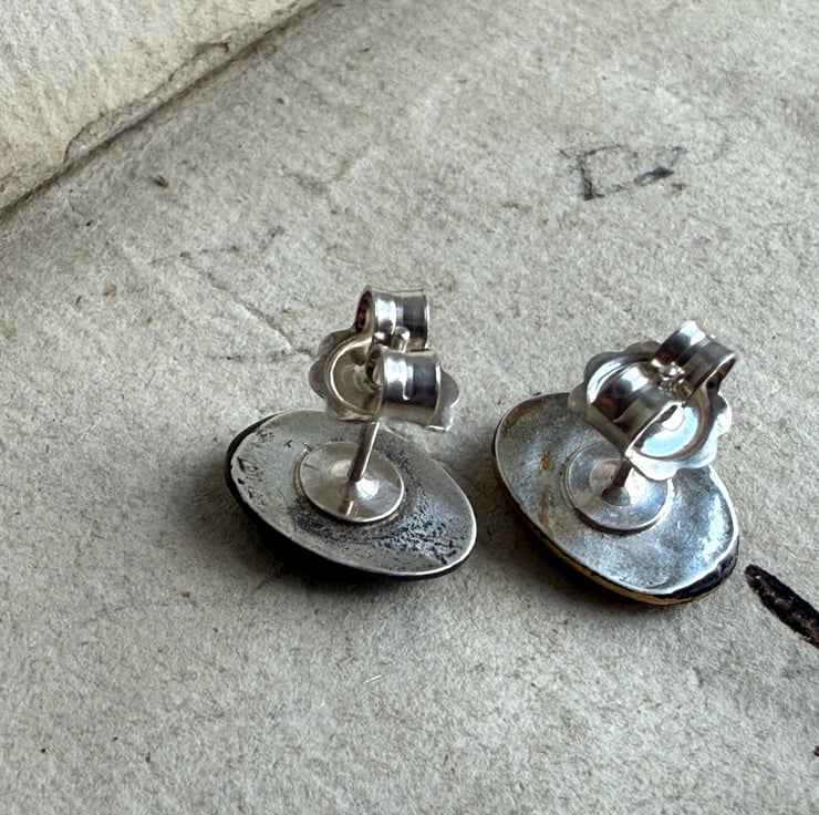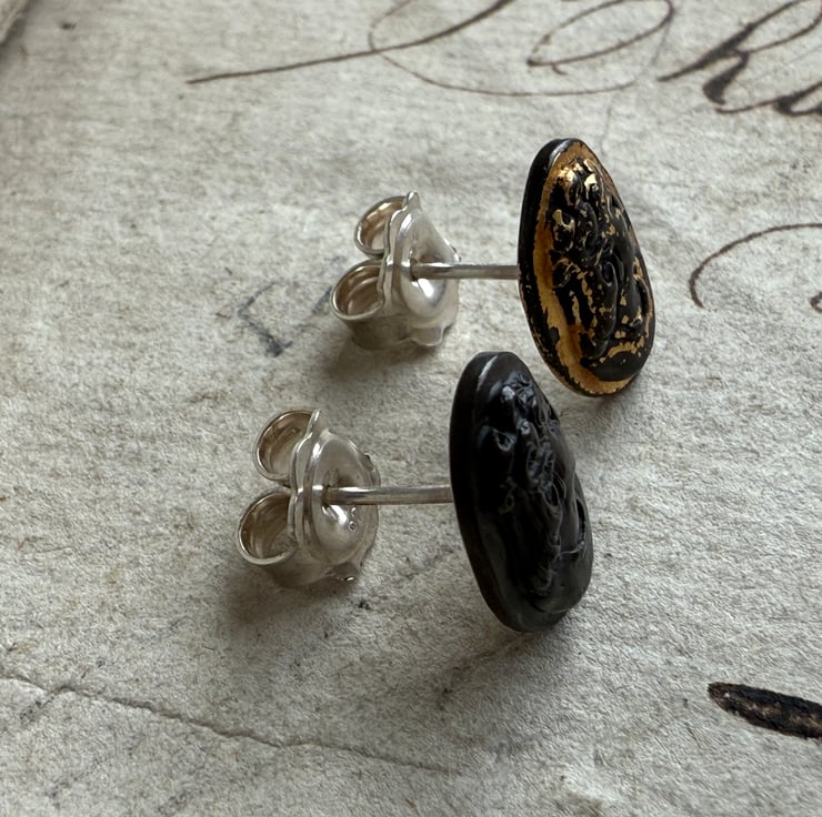 The earrings have been oxidized for an antique look and 24ct gold added two one of the studs. They also have large scroll style backings for a more secure fit.