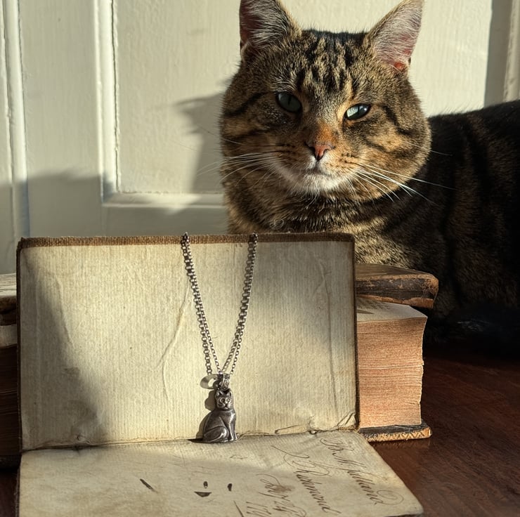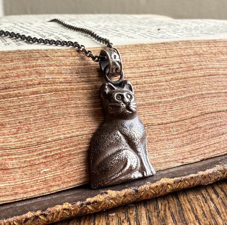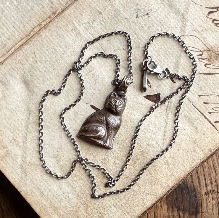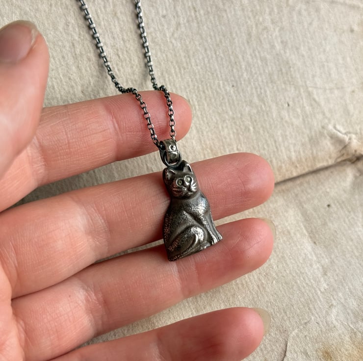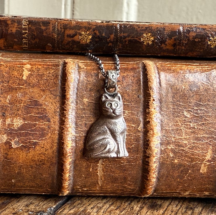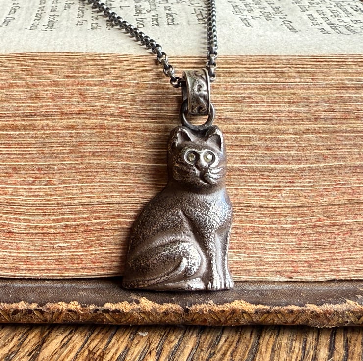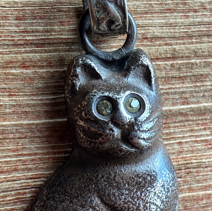 A unique black cat pendant, cast from an original vintage black Czech glass Christmas cracker charm. The eyes have been set with two yellow sapphires.