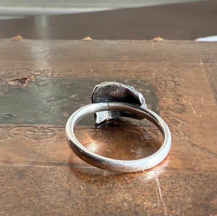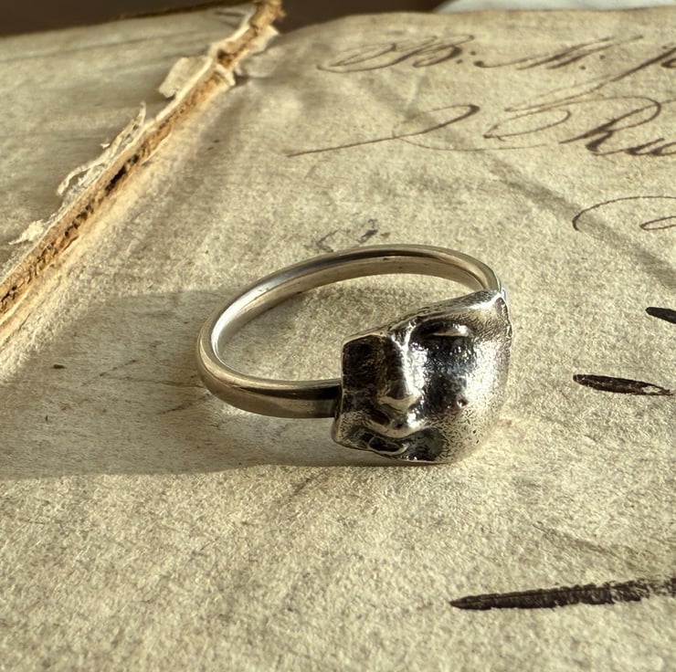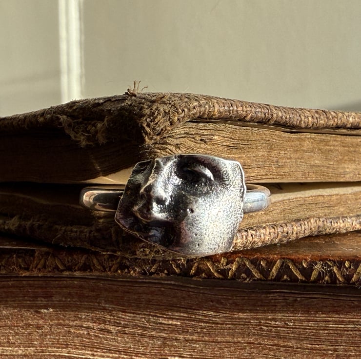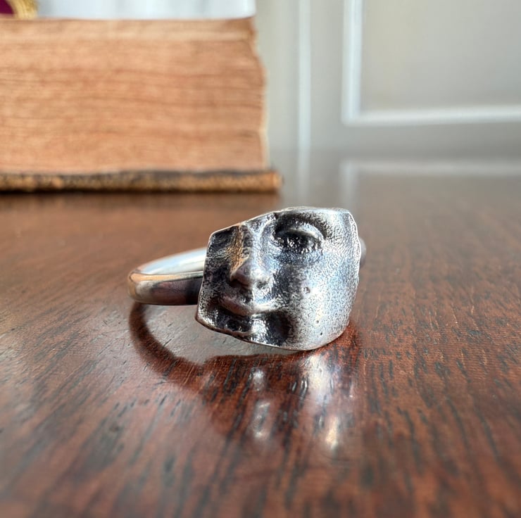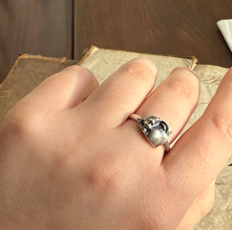 This ring is made from a silver cast of a broken porcelain Victorian doll face fragment we found during one of our mudlarking adventures. It has been cast in antique recycled sterling silver and set on a comfortable 2.5mm oval shaped band. The ring has been oxidized and rubbed back, enhancing the highlights for an antique look.