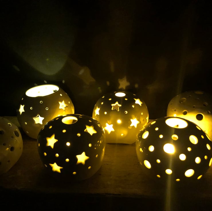 A gorgeous glossy white ‘snow dome’ tealight holder/incense burner with drilled holes pattern. The cut holes allow light from a battery operated twinkling tea-light (included) to shine through. Will also work well with incense cones (sample of 2 also supplied).
