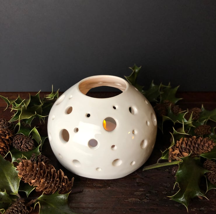 This is a wheel thrown item which has been cut away on one side to create a built-in coaster so that if real tea-lights/incense cones are used the table surface is protected (care must be taken as the dome could become hot and I advise that the dome should not be moved once lit to prevent melted wax making a mess or causing harm!).