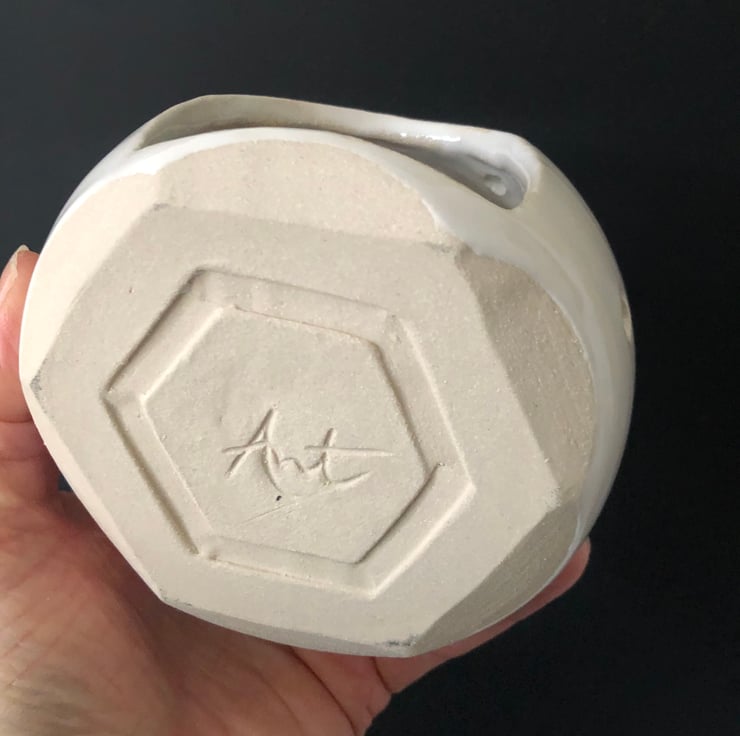The bottom features my carved hexagon design with my signature and has been left unglazed.