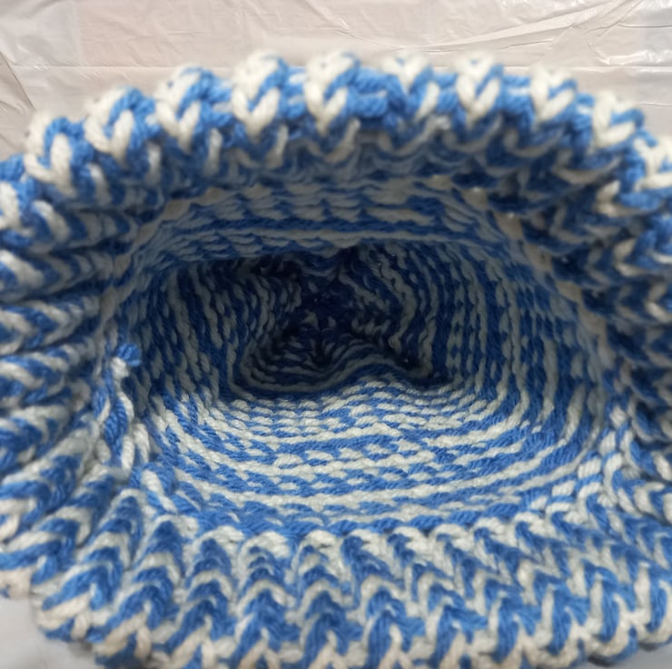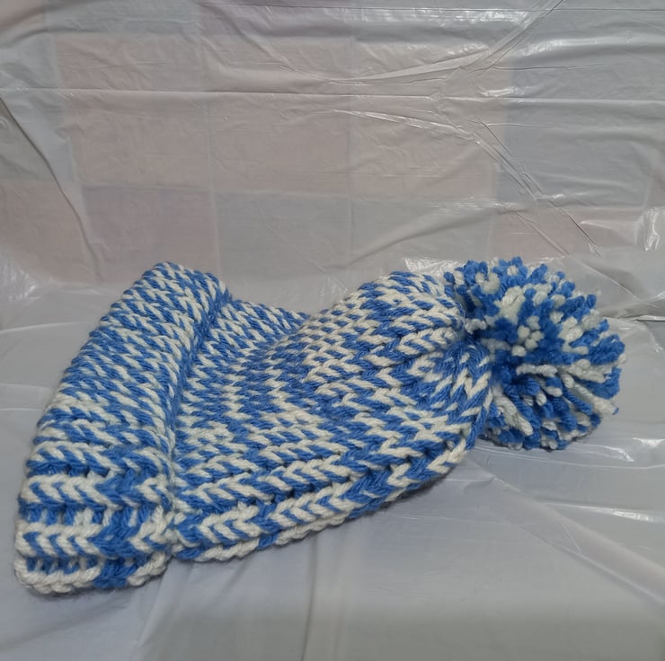 Hand knitted on a round knitting loom using two strands of a chunky wool to give the two-tone effect.