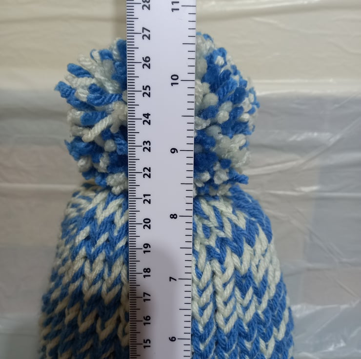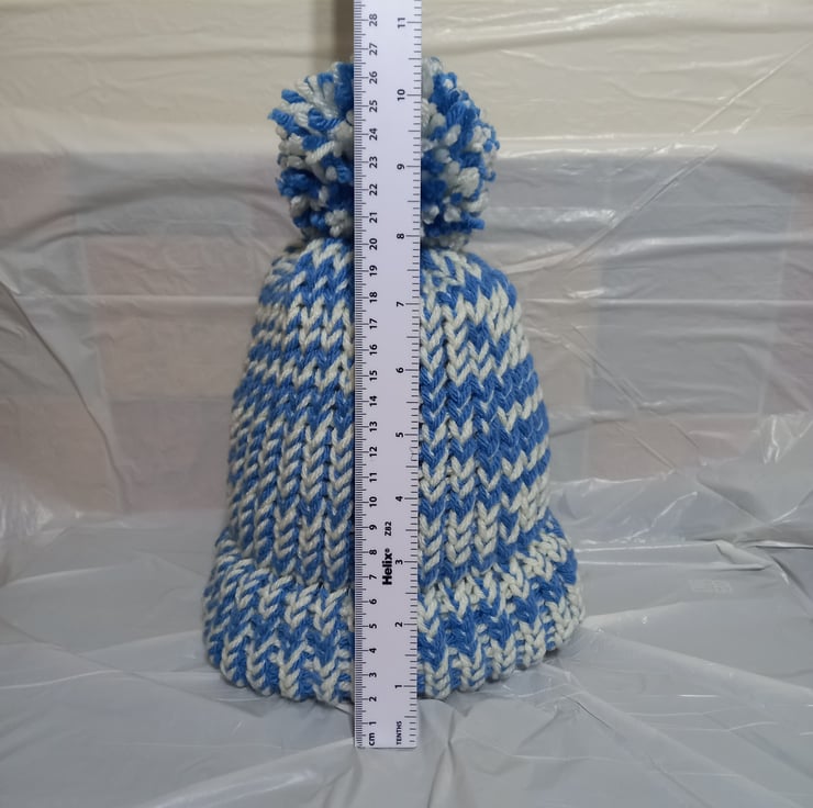 Hat & Bobble: knitted with Stylecraft Special Chunky 100% premium acrylic yarn. The yarn colours used in this hat are called “Cornish Blue & Cream”.