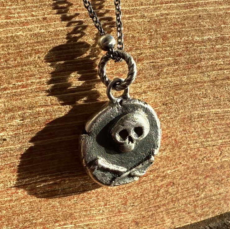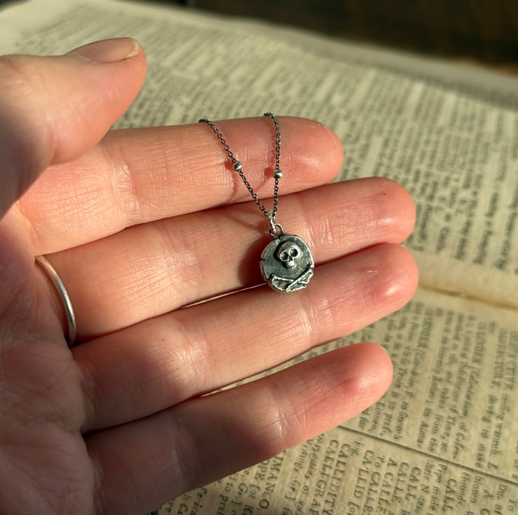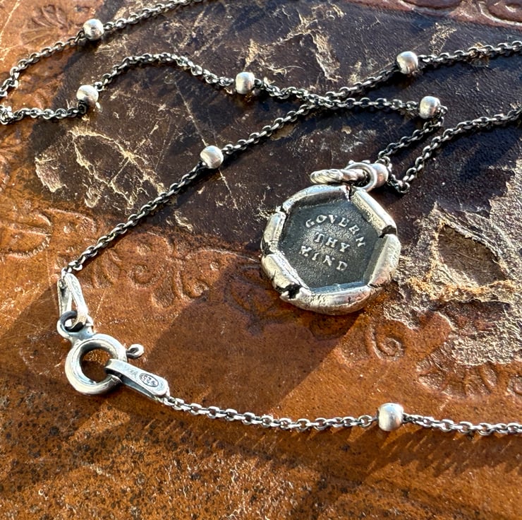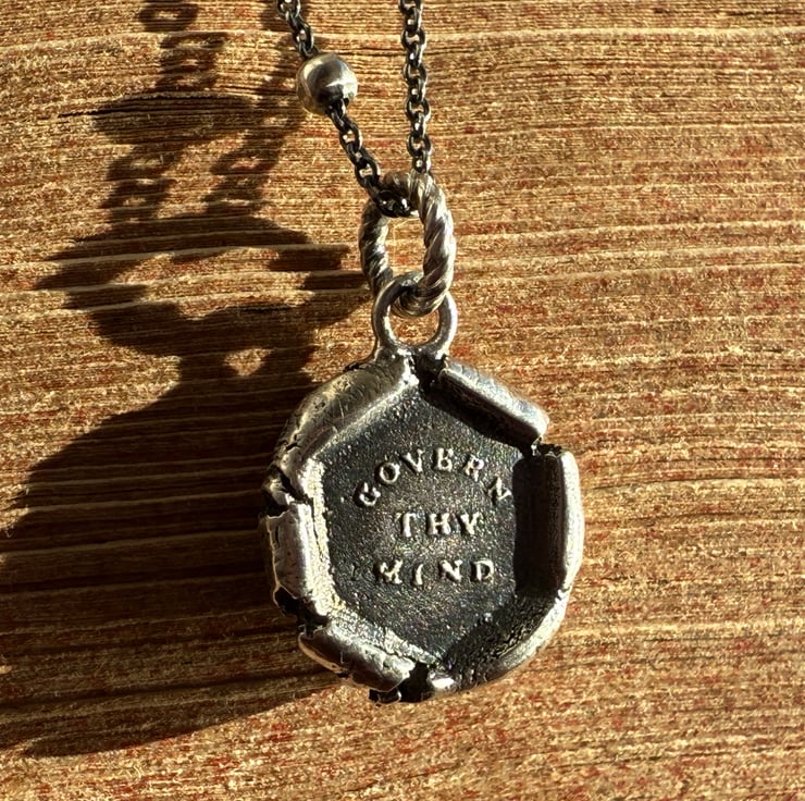 A one of a kind double-sided wax seal necklace, made from the impressions of an 18thC glass intaglio wax seal from Alex's beloved collection featuring the motto "GOVERN THY MIND". With a skull and crossbones on the reverse, Inspired by 17th & 18th century gravestones. It is made in recycled sterling silver and has been oxidized and rubbed back, enhancing the highlights for an antique look.