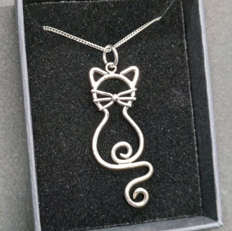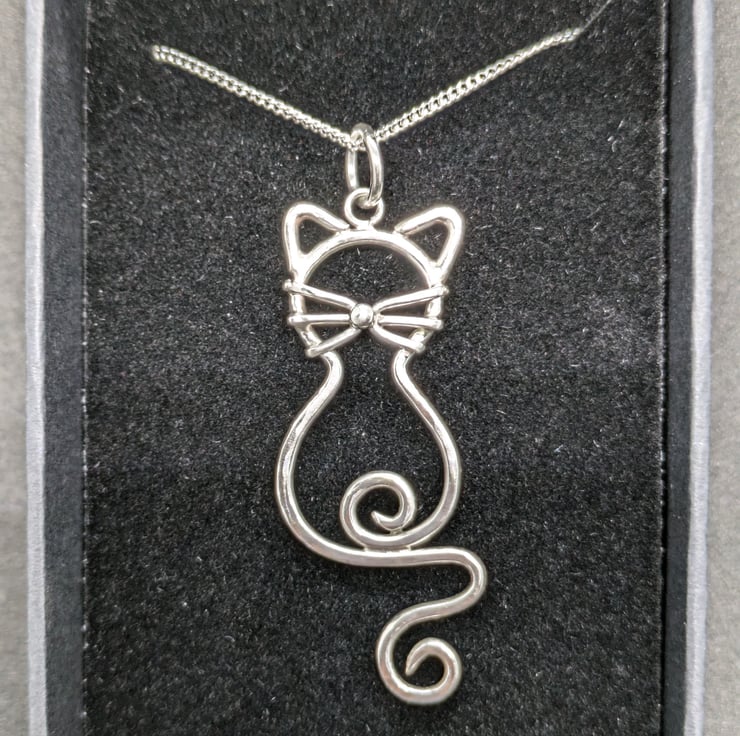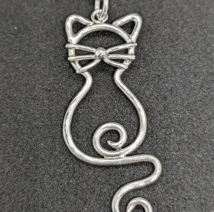 This cute cat pendant has been hand forged from sterling silver wire. It measures approximately 4.5cm from the tip of his ear to the curl of his tail. The pendant has been hammered to create texture and a sterling silver nose and whiskers added, for extra feline character. The pendant hangs from an 18 inch sterling silver curb chain. It would make a special and original Christmas gift for anyone who loves cats, animals or just fun jewellery.