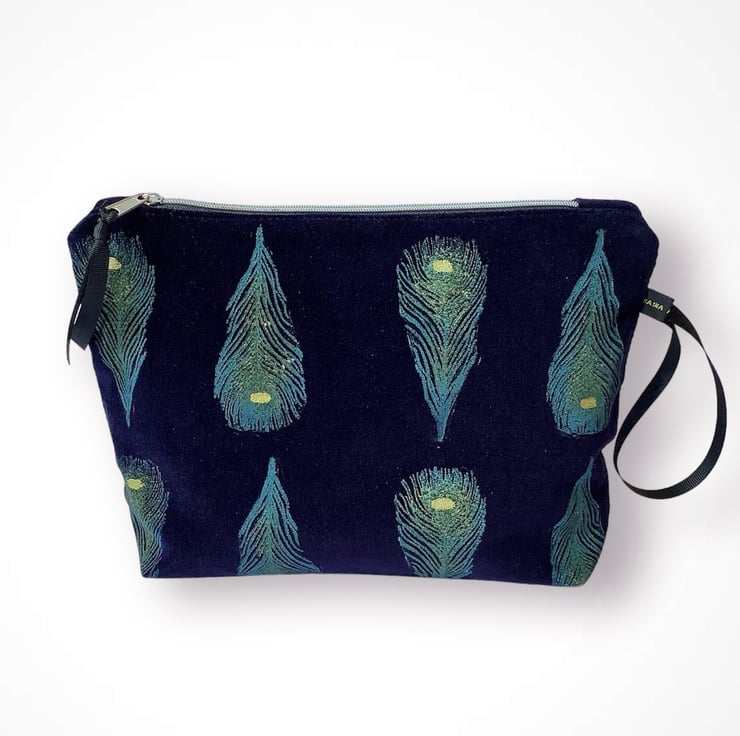 Indulge in luxury and make a statement with our luxurious Midnight Blue Peacock Feathers Velvet Makeup Bag.