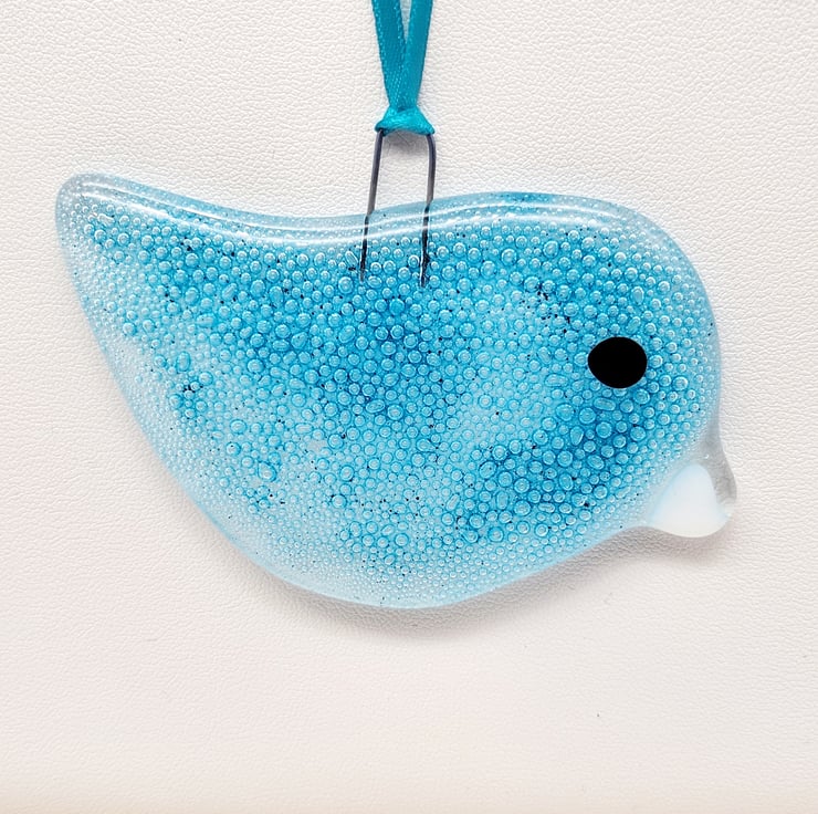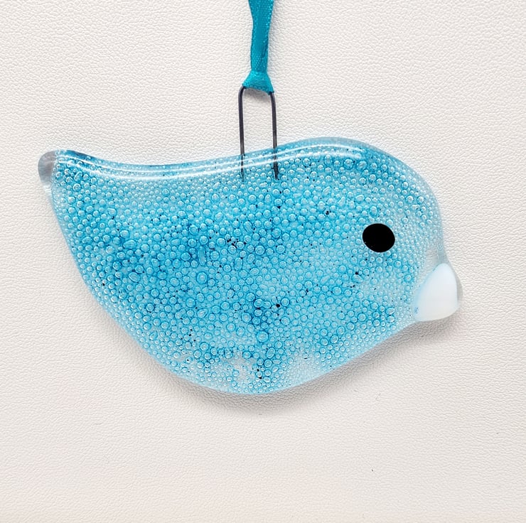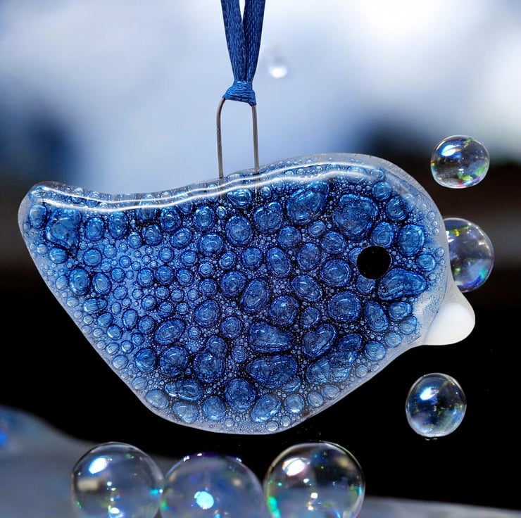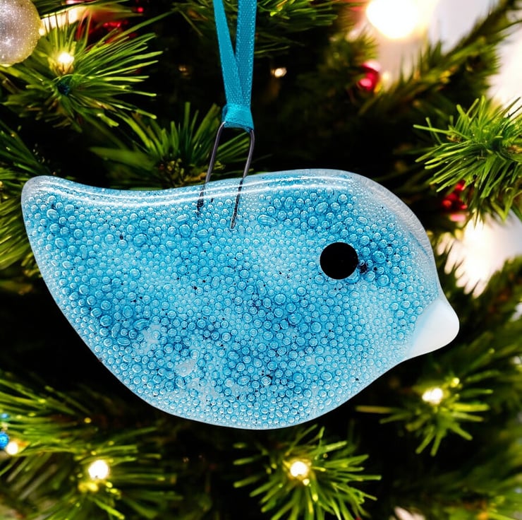 This delightful fused glass bird features incorporated bubbles. It is created by hand-cutting sheet glass, painting with bubble glass paint, and firing in a kiln. A high-firing hook is included, making it easy to hang. A coordinating ribbon adds a polished touch. While it is displayed on a Christmas tree, it can be hung year-round.