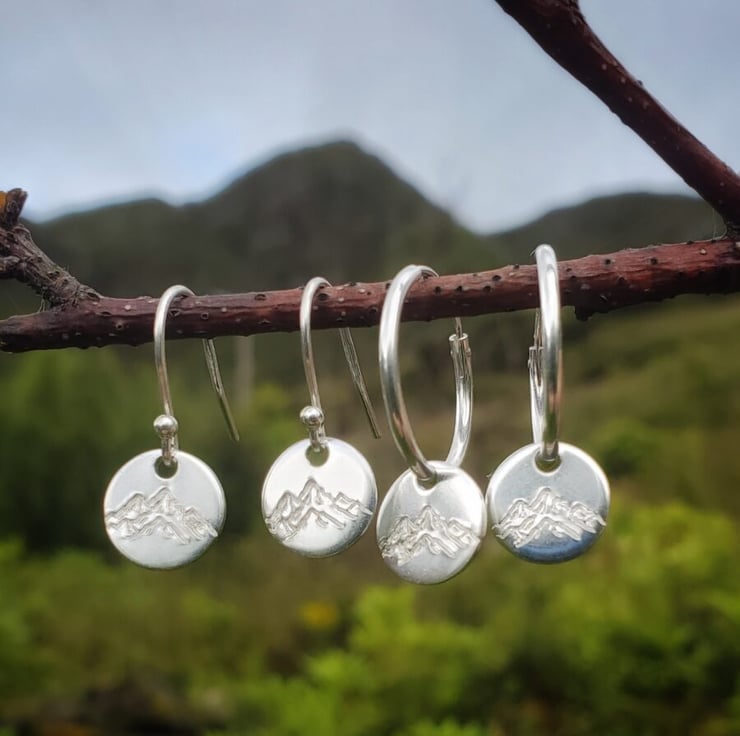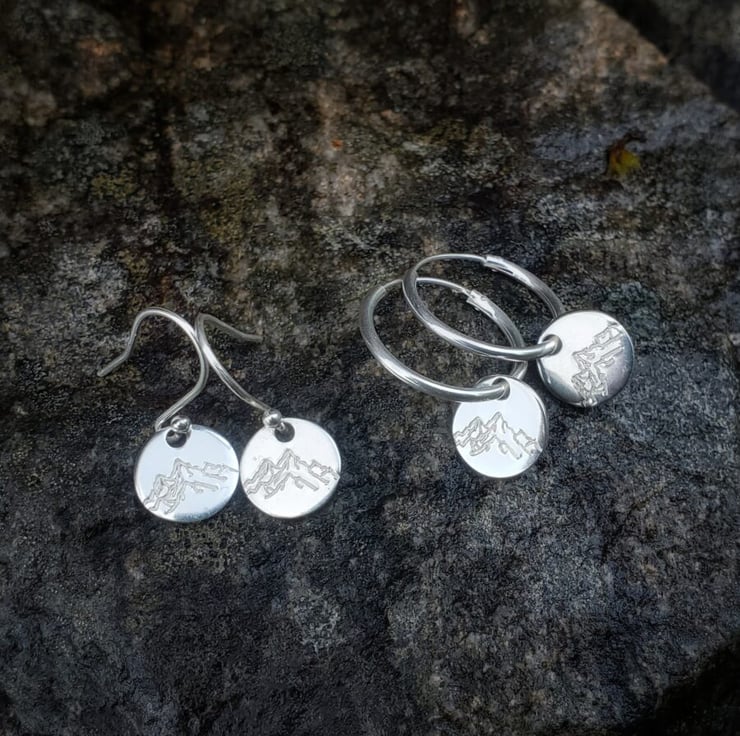 The disks measure 10mm across and are sterling silver with a mountain range stamped on them.
