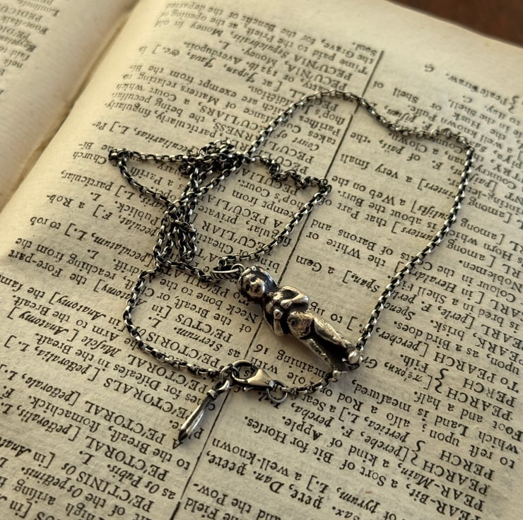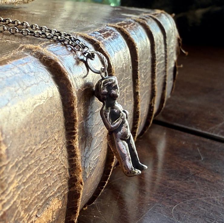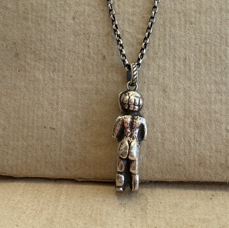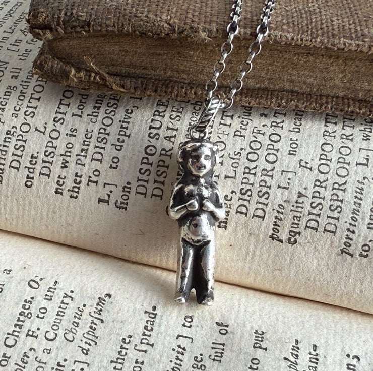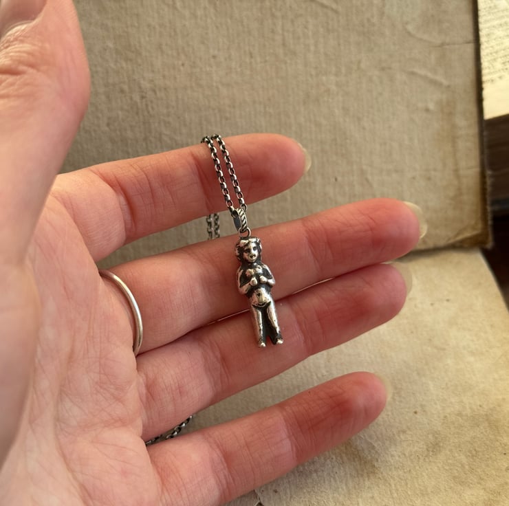 Hand cast solid silver frozen Charlotte/ pudding doll necklace. The cast was taken from an original antique, German-made porcelain doll.