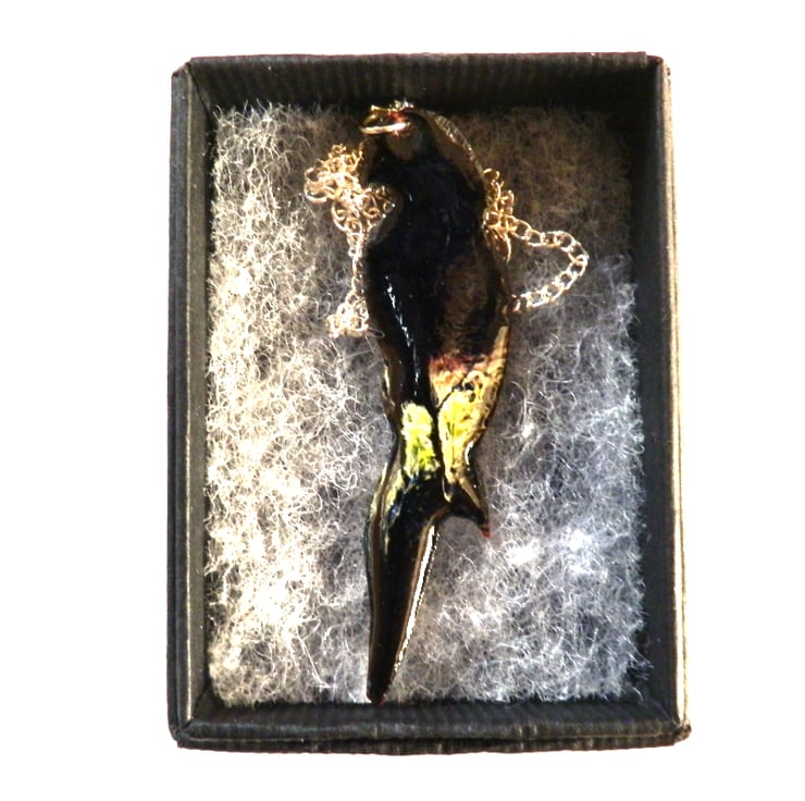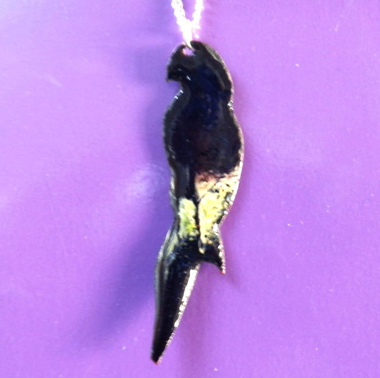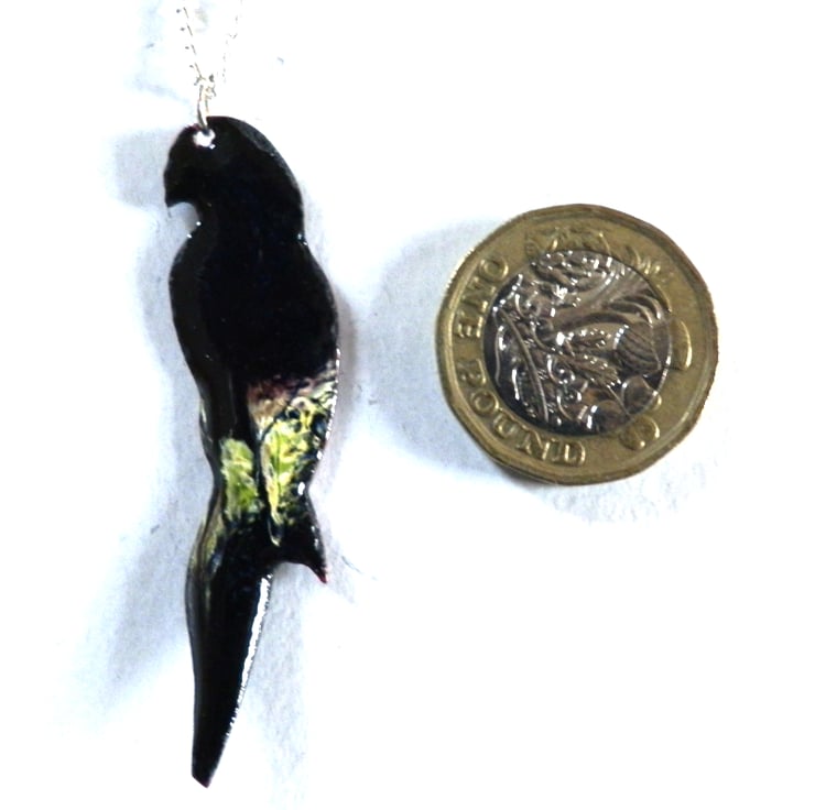 The parrot is 53mm long, 14mm across its shoulders. It is mounted on a 45mm silver plate, curb chain that fastens with a simple bolt ring.