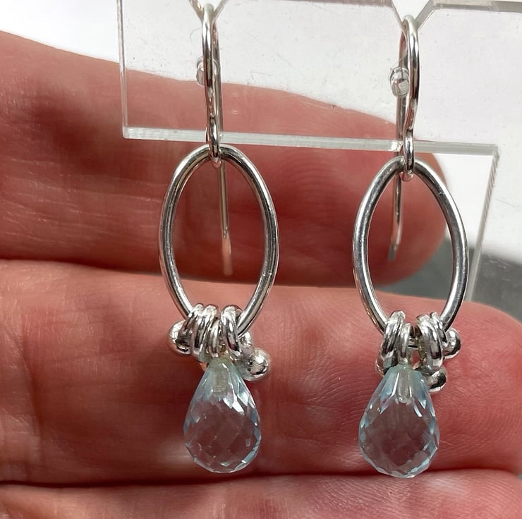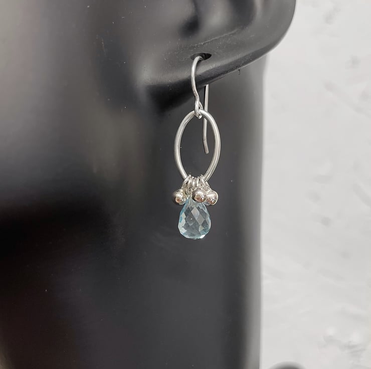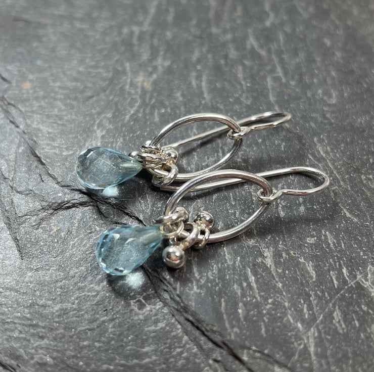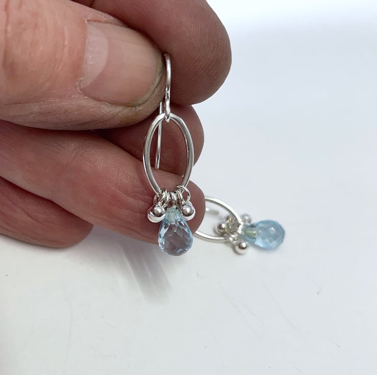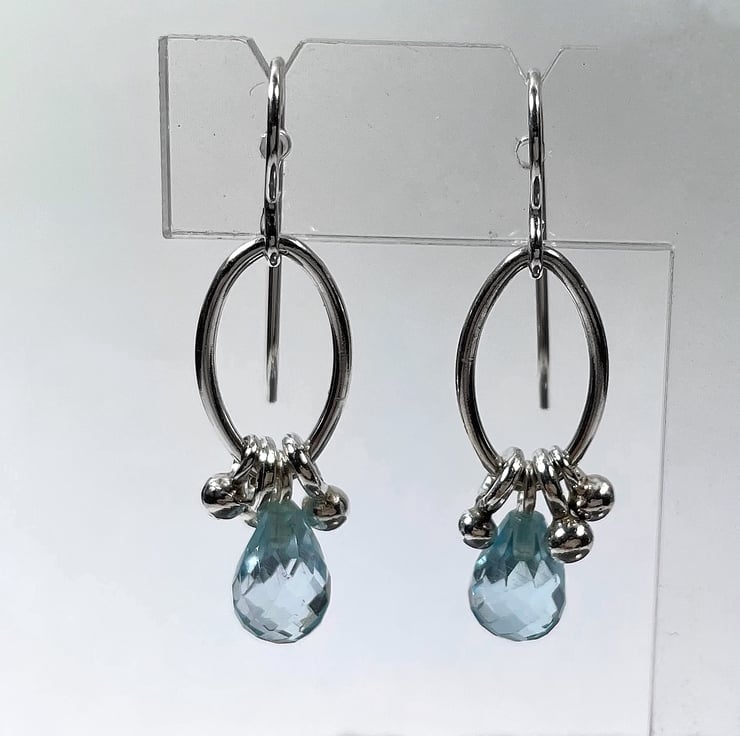 These earrings see teardrop faceted blue topaz gemstones hung with a cluster of shiny silver bobbles below silver marquis shaped hoops. They have handmade hook ear wire fittings.