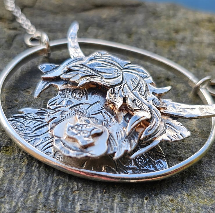 Made entirely out of sterling silver he has been textured and layered up to give as much depth as possible. He has then made through a lost wax casting process, finished by hand, and oxidised to highlight every detail.