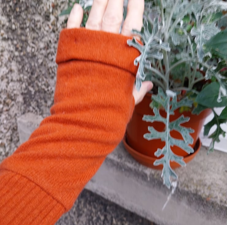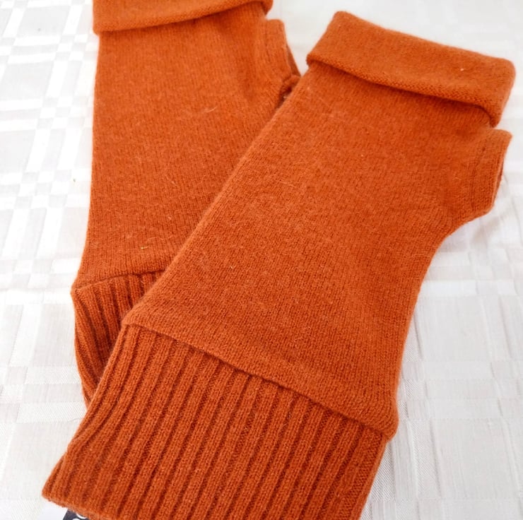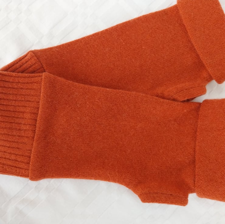 This is a pair of recycled cashmere fingerless gloves that keep your wrists and hands warm while freeing your fingers. They are made from 100% cashmere garments that I have repurposed. These garments are used cashmere cardigans and jumpers which I wash, slightly felt and de-bobble to make the fabric beautiful again. This pair of rusty-orange fingerless gloves will keep your hands warm in lightweight, luxurious cashmere. They would also make a wonderful gift for someone!