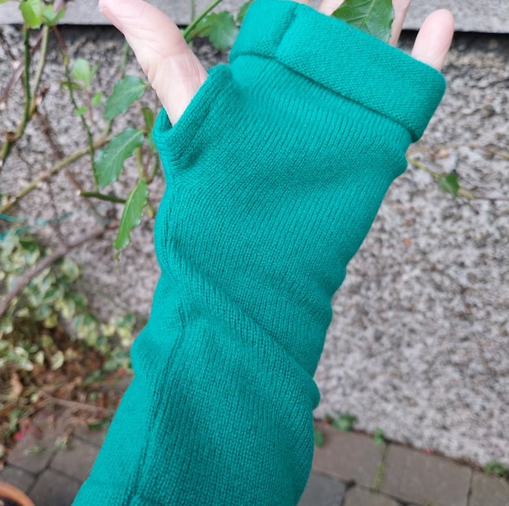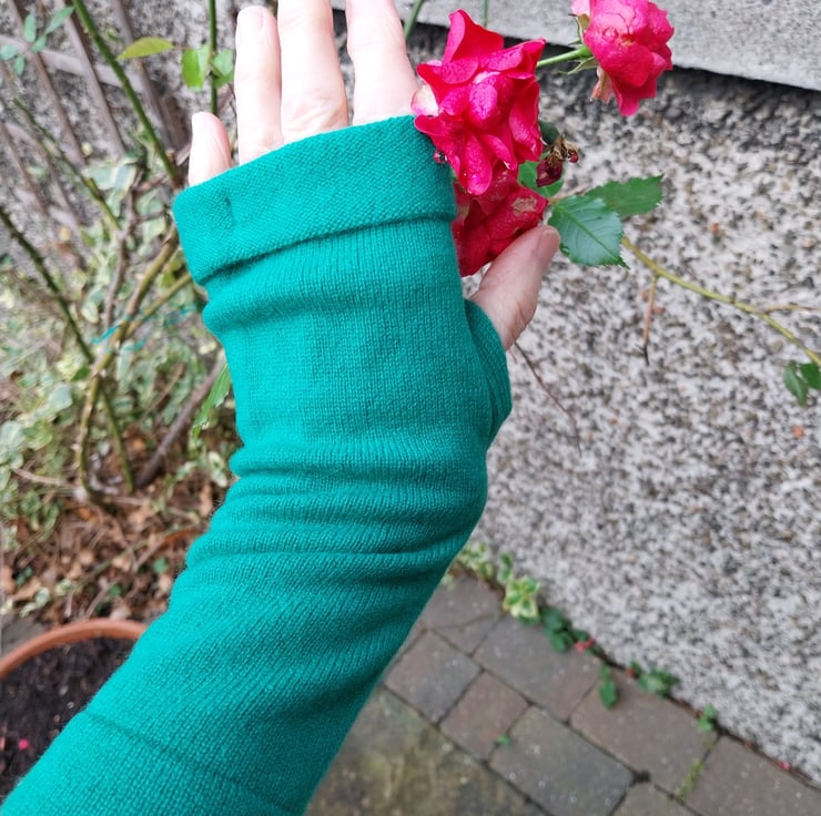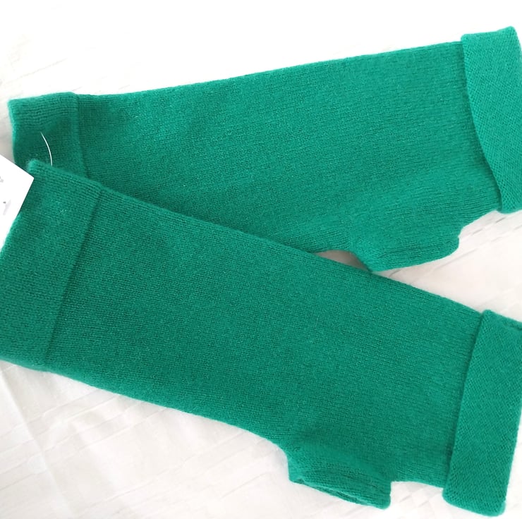 This is a pair of recycled cashmere fingerless gloves that keep your wrists and hands warm while freeing your fingers. They are made from 100% cashmere garments that I have repurposed. These garments are used cashmere cardigans and jumpers which I wash, slightly felt and de-bobble to make the fabric beautiful again. This pair of green fingerless gloves will keep your hands warm in lightweight, luxurious cashmere. They would also make a wonderful gift for someone!