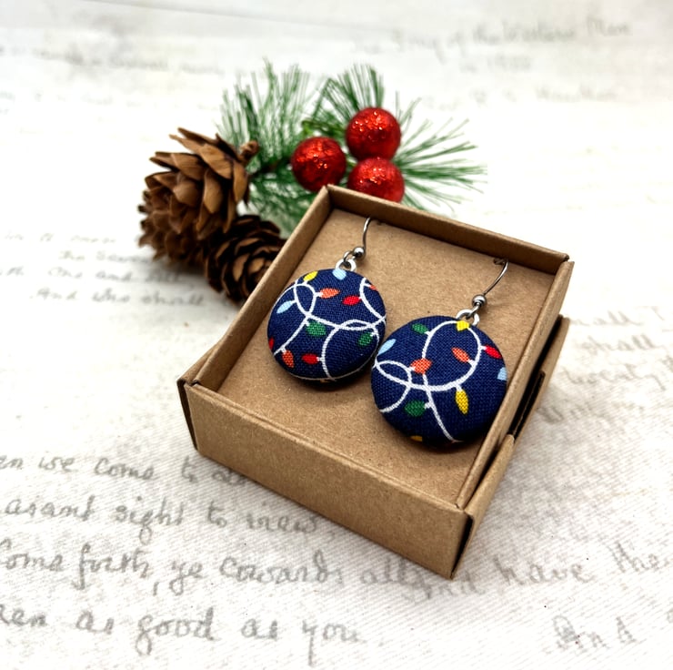 Christmas fairy lights fabric button dangle earrings Liberty fabric festive