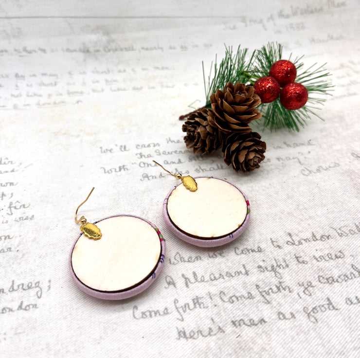 On the reverse, I’ve secured a circle of FSC approved wood in the back recess of the button and sealed the reverse with artist’s clear varnish. Gold plated leaf shaped bails have been added to the back of each earring and has been teamed with gold plated surgical steel earring hooks with ball detail.