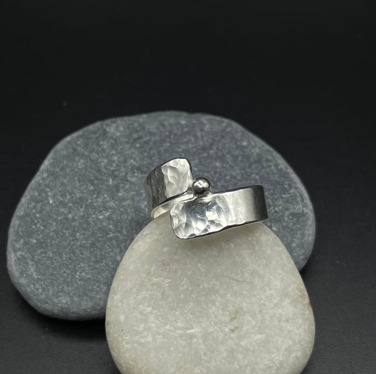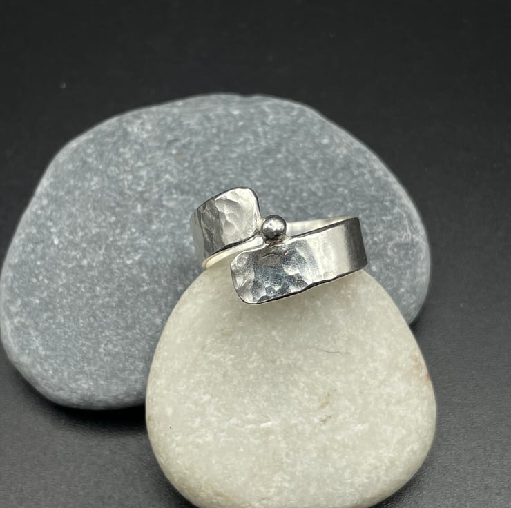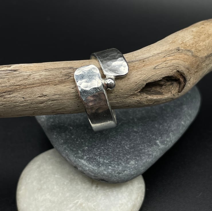 This lovely ring has been hammered towards the front of the band where the two ends join. A little silver ball secures the ends.