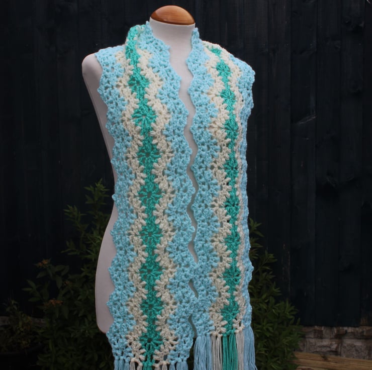 A stunning stitch pattern elevates any scarf to a one-of-a-kind accessory! This scarf features a beautifully textured lace stitch, crocheted in a wavy design that exudes elegance in brand new cream acrylic yarn, new aspen coloured yarn, together with some older aqua acrylic yarn. Its generous length allows for a relaxed, stylish wrap around your neck, offering endless possibilities for tying and styling. Embrace the versatility and charm that this scarf brings to your wardrobe!