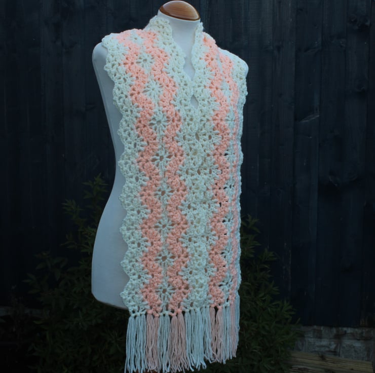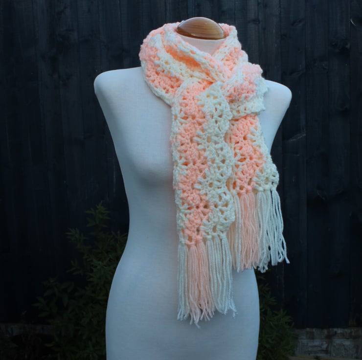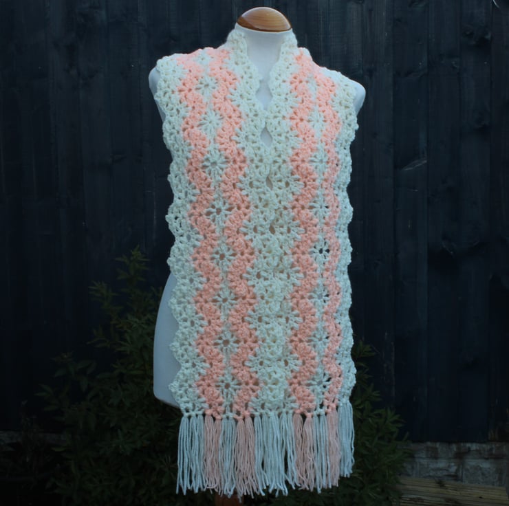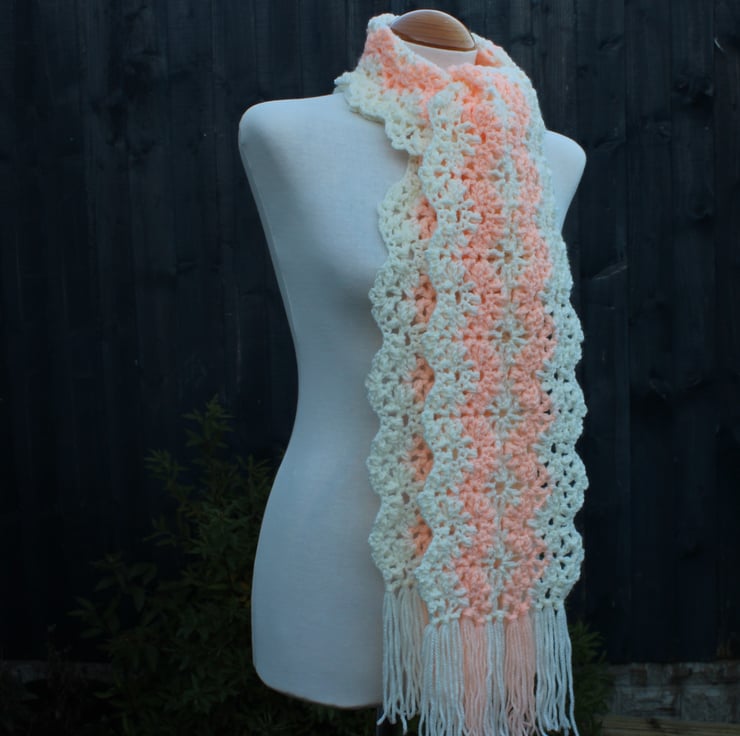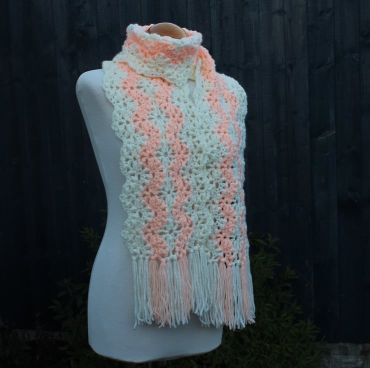 A stunning stitch pattern elevates any scarf to a one-of-a-kind accessory! This scarf features a beautifully textured lace stitch, crocheted in a wavy design that exudes elegance in brand new cream acrylic yarn, together with some older peach acrylic yarn. Its generous length allows for a relaxed, stylish wrap around your neck, offering endless possibilities for tying and styling. Embrace the versatility and charm that this scarf brings to your wardrobe! .