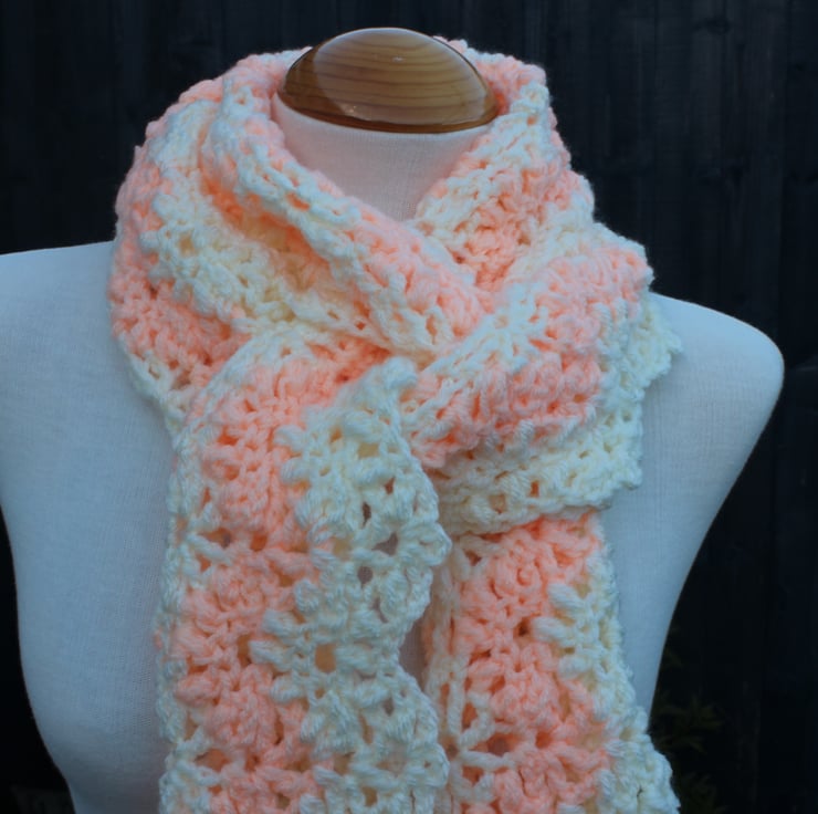 If you would like to see more photographs and read about how this scarf was made please visit my blog post about it. https://drapedinlacebyjuliablakeman.blogspot.com/2024/11/peach-and-cream-lacy-crochet-scarf.html