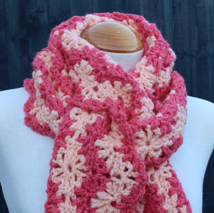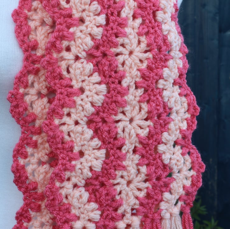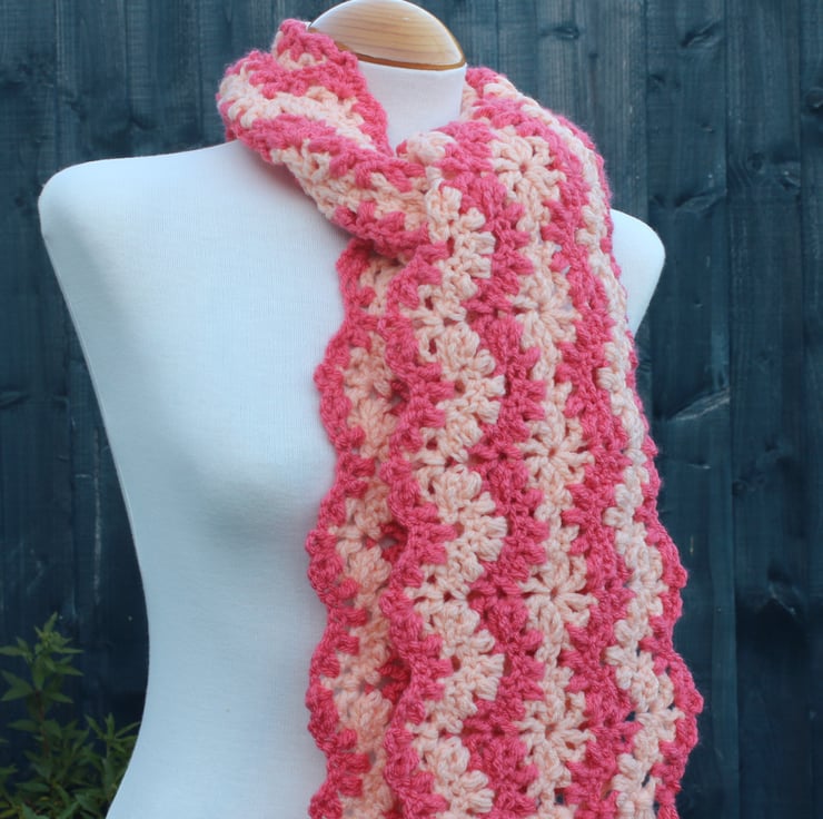 If you would like to see more photographs and read about how this scarf was made please visit my blog post about it. https://drapedinlacebyjuliablakeman.blogspot.com/2024/11/peach-and-watermelon-lacy-crochet-scarf.html