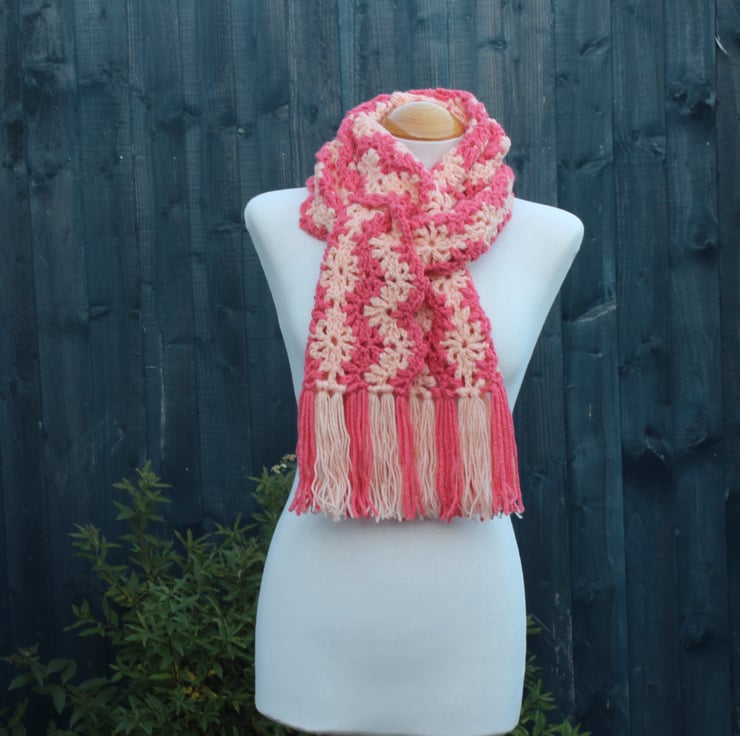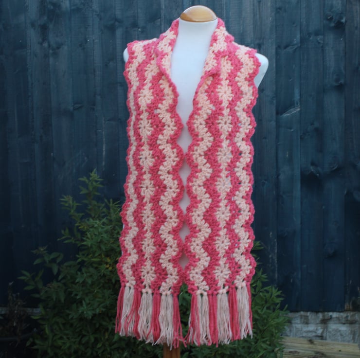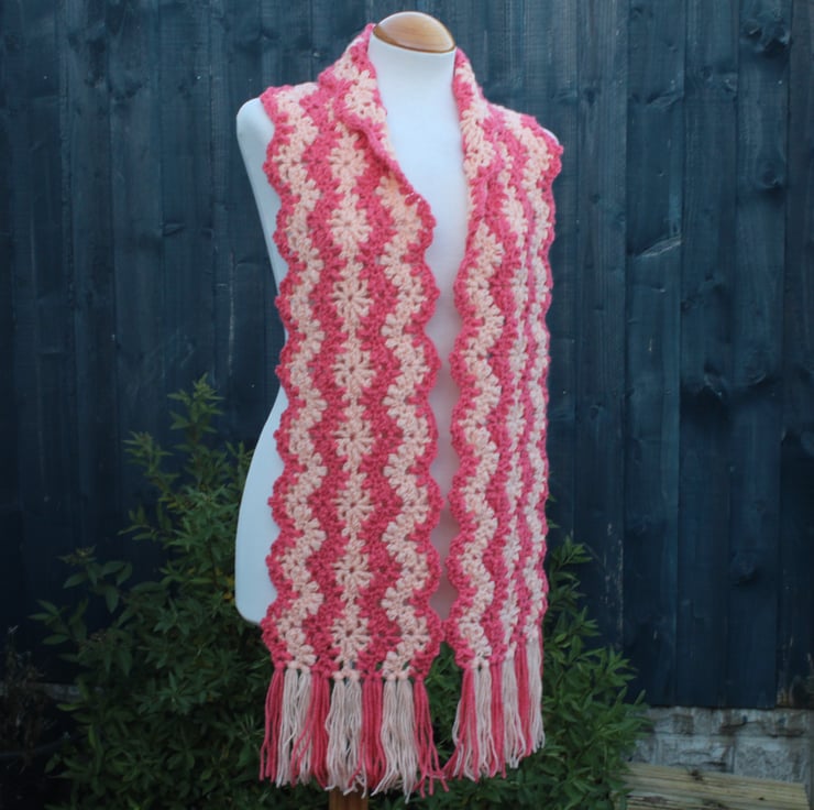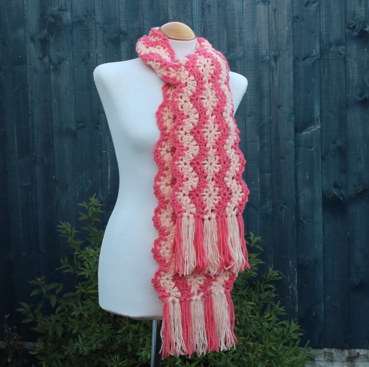 A stunning stitch pattern elevates any scarf to a one-of-a-kind accessory! This scarf features a beautifully textured lace stitch, crocheted in a wavy design that exudes elegance in brand new watermelon colour acrylic yarn, together with some older peach colour acrylic yarn. Its generous length allows for a relaxed, stylish wrap around your neck, offering endless possibilities for tying and styling. Embrace the versatility and charm that this scarf brings to your wardrobe!