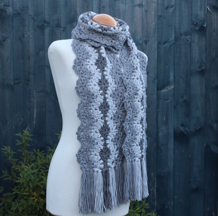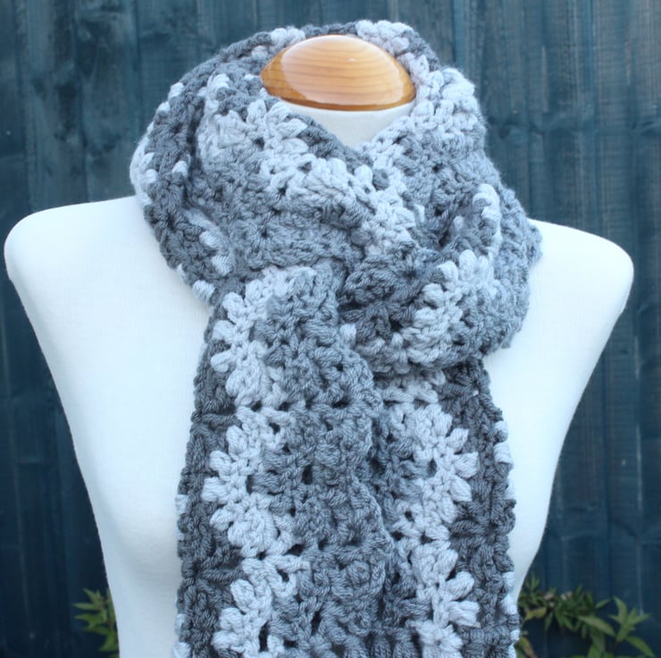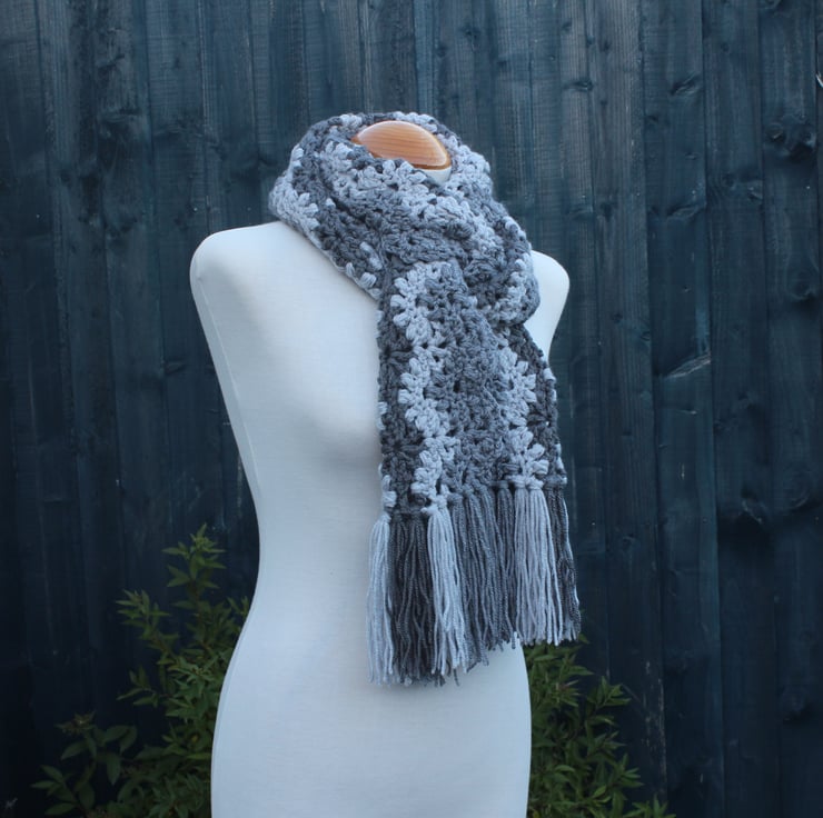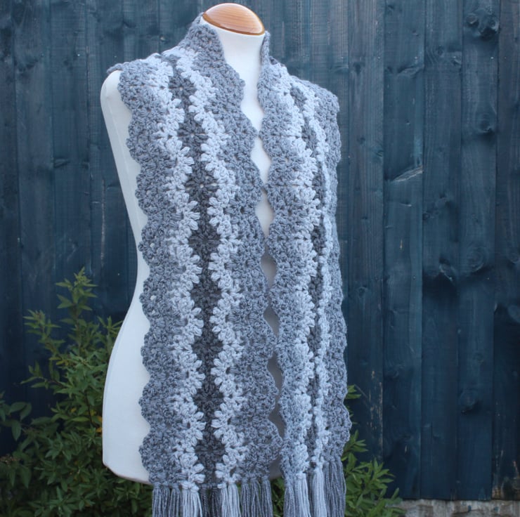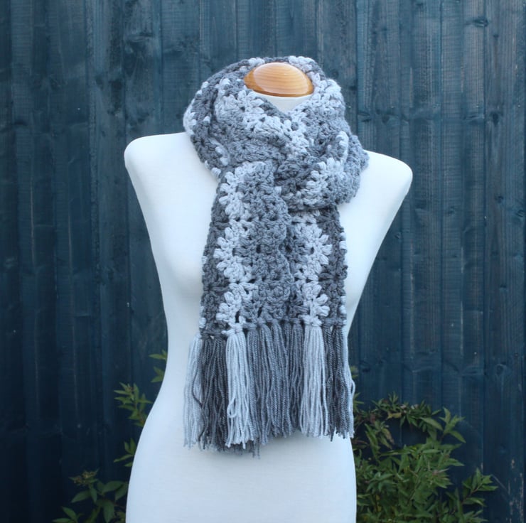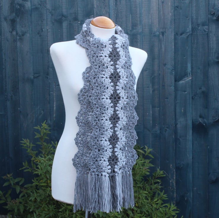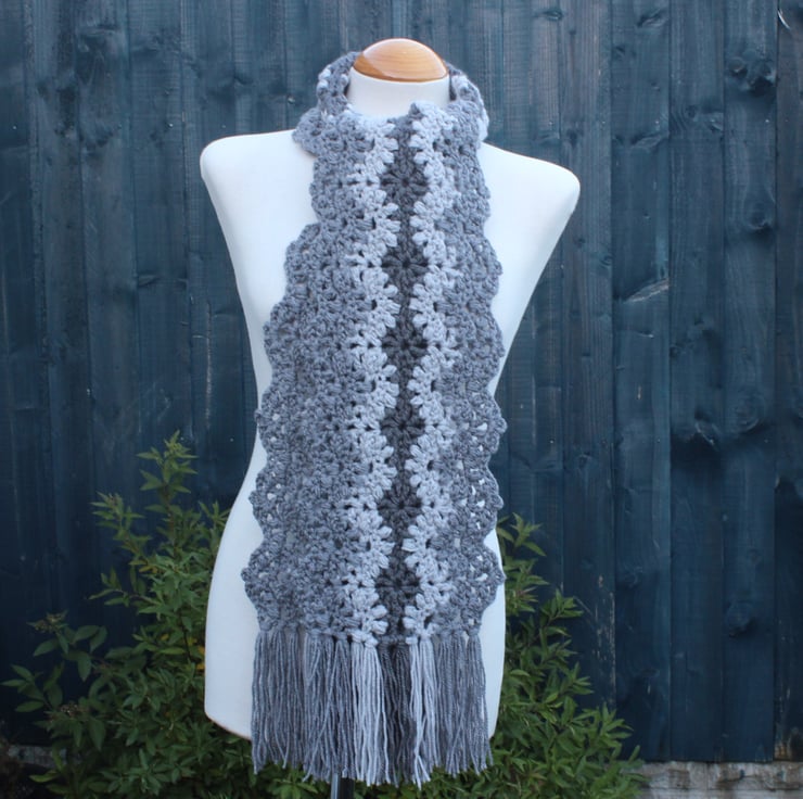 If you would like to see more photographs and read about how this scarf was made please visit my blog post about it. https://drapedinlacebyjuliablakeman.blogspot.com/2024/11/three-shades-of-grey-lacy-crochet-scarf.html