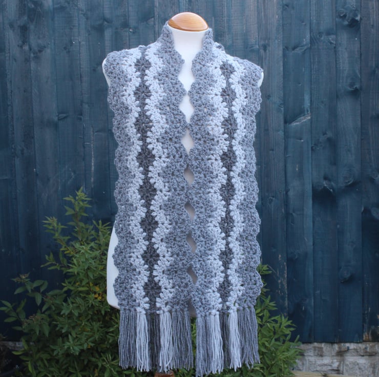 A stunning stitch pattern elevates any scarf to a one-of-a-kind accessory! This scarf features a beautifully textured lace stitch, crocheted in a wavy design that exudes elegance in three shades of grey acrylic yarn. Its generous length allows for a relaxed, stylish wrap around your neck, offering endless possibilities for tying and styling. Embrace the versatility and charm that this scarf brings to your wardrobe!