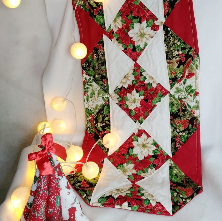 A quilted table runner with a stunning festive foliage design and featuring a red cardinal makes this a very special addition to your festive table decor. The use of rich reds , greens, ivory, and black is made even more striking by adding golden accents.