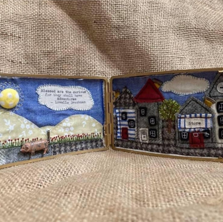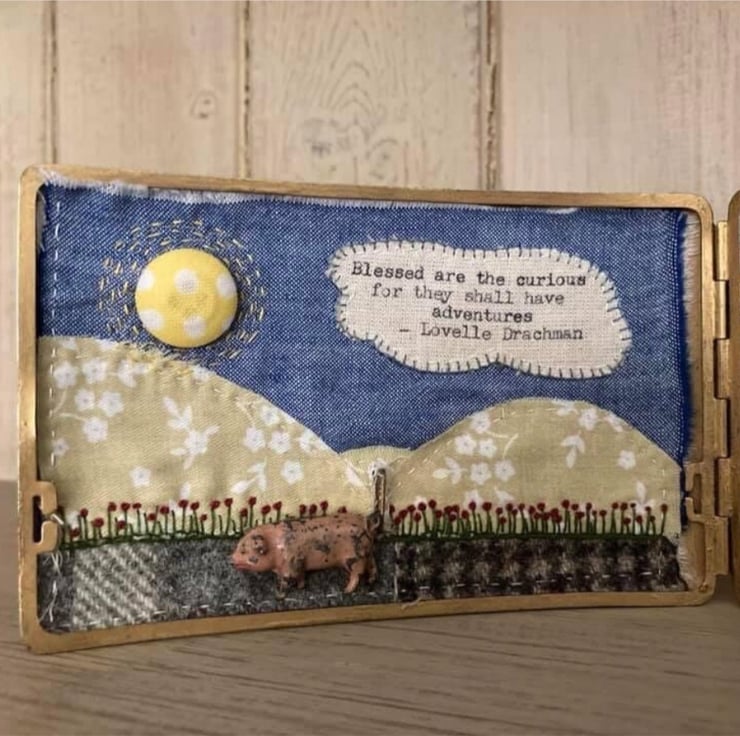 A vintage cigarette case makes a unique frame for this piece of fibre art - a hand embroidered and appliquéd scene, featuring glass seed beads, buttons, an inspirational quote, and a little vintage lead pig.