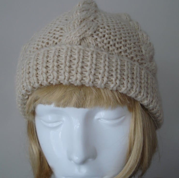 This is a lovely cream hat knitted with acrylic and Alpaca yarn. It is really super soft and fits an adult head. The cable pattern gives plenty of stretch so that it clings nicely to the head. Pop it in your pocket or bag for those winter days.