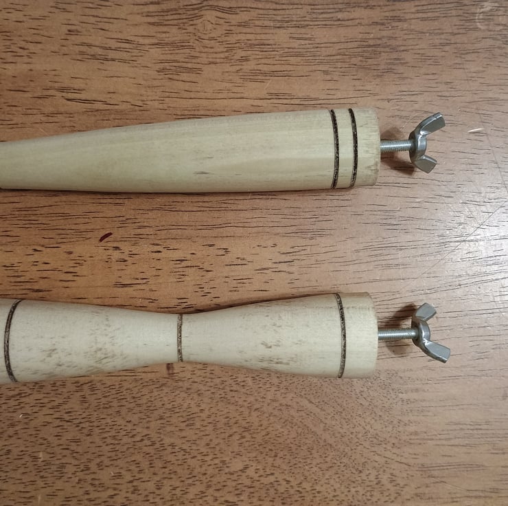 The hourglass design is 25mm (1") in diameter at the top, 15mm (58") at the narrow point and 25mm at the base, the tapered design goes from 25mm at the top to 15mm at the base.