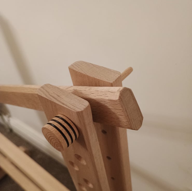 The uprights have multiple holes drilled through to allow a high degree of adjustment to keep either a flat frame or angled to your preference. As a premium item, your trestles include 5 hand turned ring pegs from matching beech cherry walnut, each with 3 rings burned into the wood for extra grip.