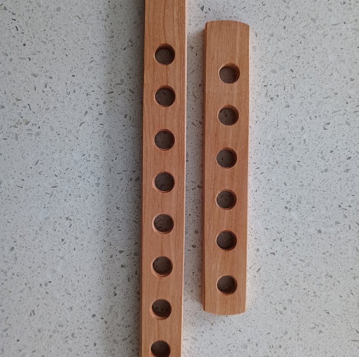 9mm holes (approx 38") are spaced at 20mm intervals and lightly chamfered before the whole organiser is sanded to a fine grade and finished with lacquer. The length of the organiser depends on the number of holes you choose, the 6 hole version is approximately 15cm long, 8 holes is 19cm long and 10 holes is 23cm long.