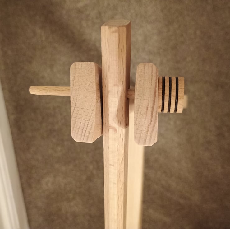 A handmade, wooden ring peg to replace steel bolts when putting together trestles, slate frames and other tapestry embroidery lacemaking frames.