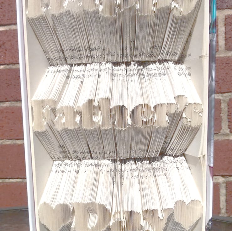 BOOK REQUIREMENT: A hardback book at 23cm tall, with at least 589 pages. Cut your book at 7.7cm and 15.3cm, ensuring you do not cut more than halfway through, as this could affect the book's stability.