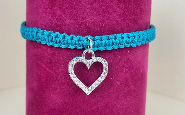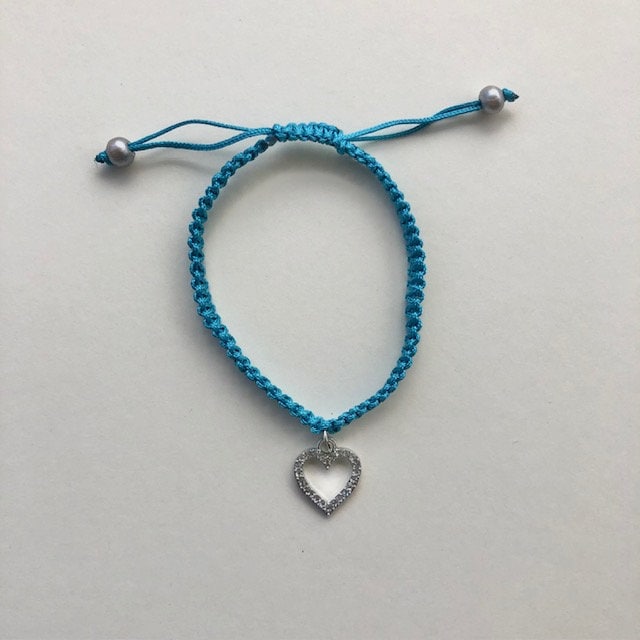 Macrame friendship bracelet with diamante heart charm and silver coloured wooden beads.