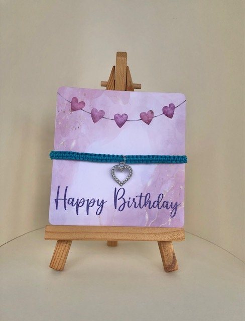 The bracelet comes displayed on a backing card which can be personalised. For example, you can have a name or it can say best friend. You can chose if you want the pink text design or the purple one.