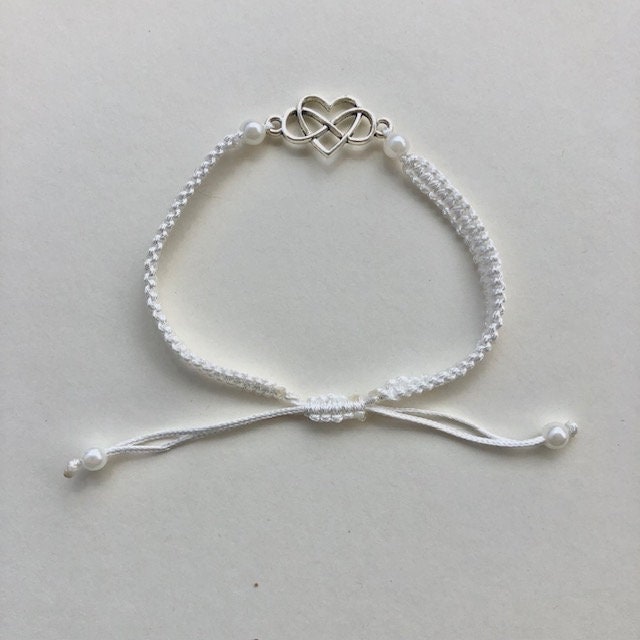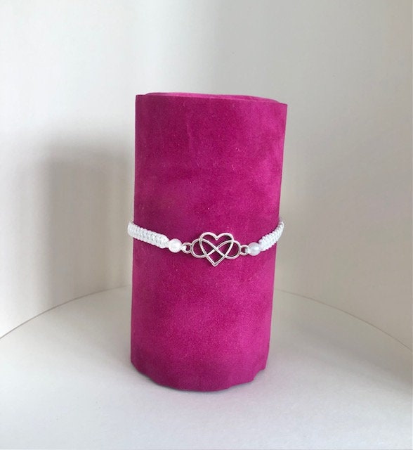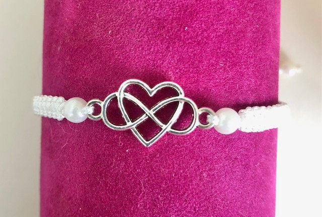 Macrame friendship bracelet with infinity heart charm and pearlised beads.