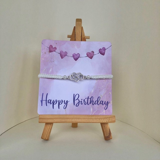The bracelet comes displayed on a backing card which can be personalised. For example, you can have a name or it can say best friend. You can chose if you want the pink text design or the purple one.