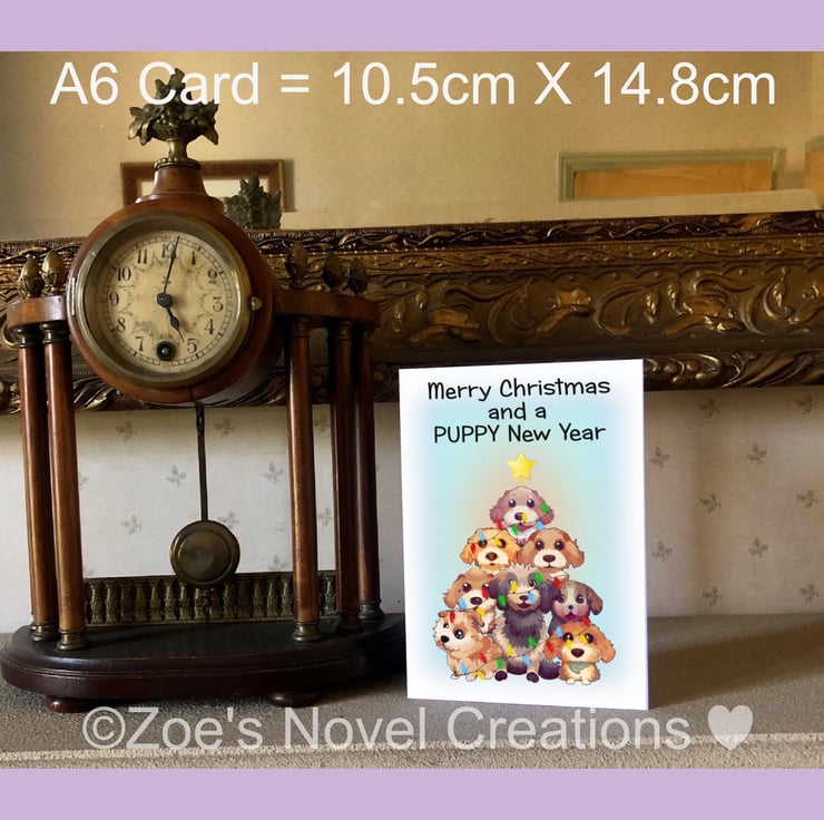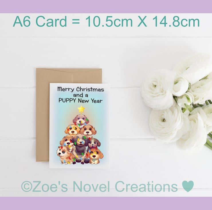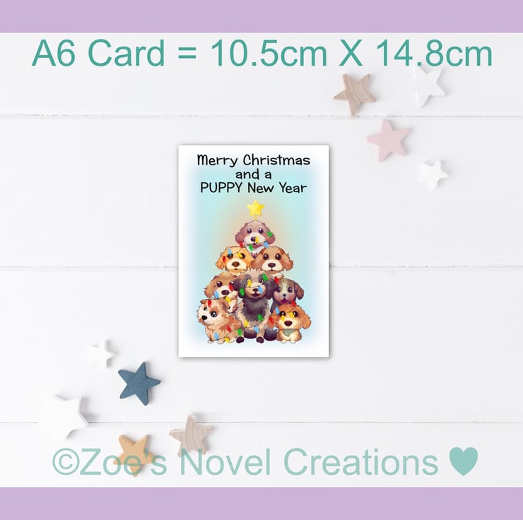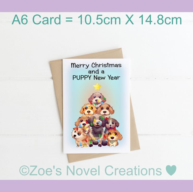 Puppies Christmas Tree Card - A6 size 10.5cm X 14.8cm