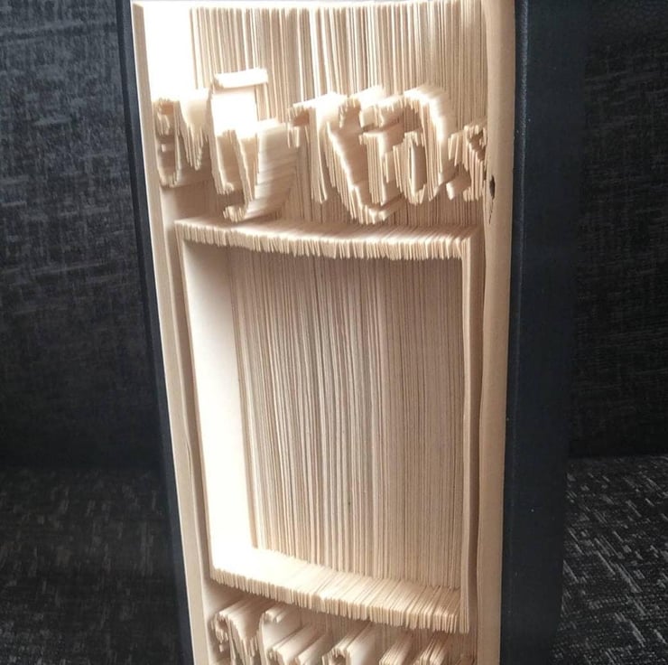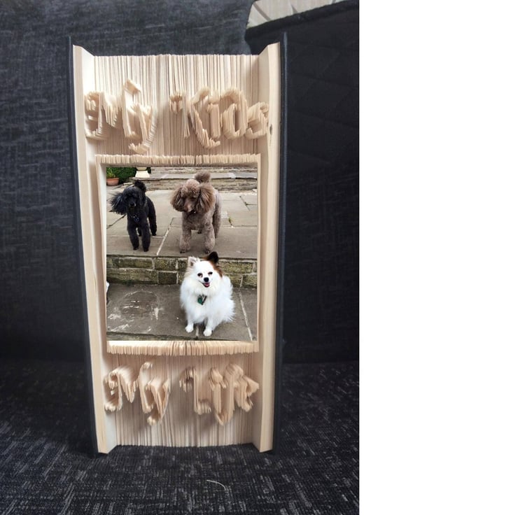 This listing is for a book folding pattern that enables you to create a book with the design pictured. Dog photo has been inserted to give you an idea how a photo will look. These are my own 'kids' and are not included. The photo area is approx. 8cm wide X 10cm deep depending on the thickness of the pages