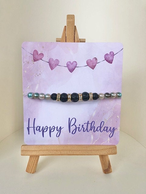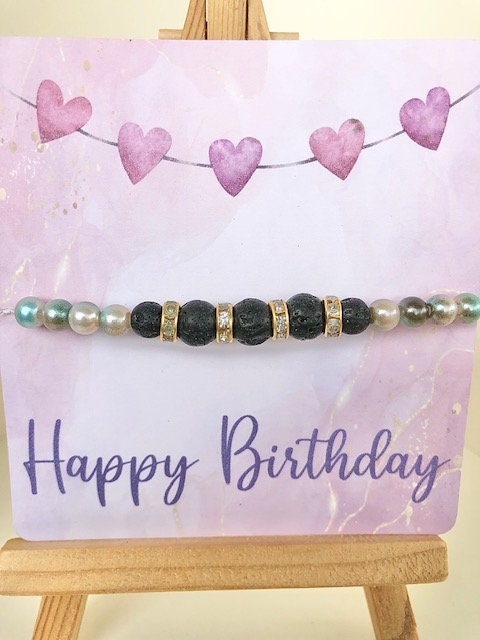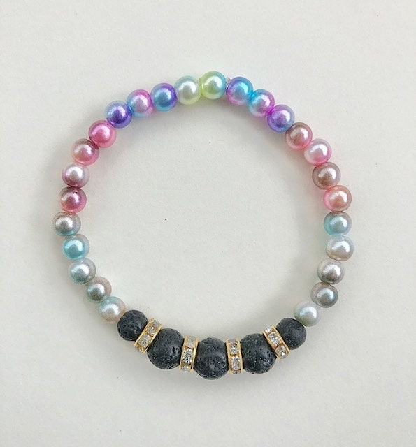 This handmade bracelet is 7 linches ong and is made using beautiful beads of several complementary colours, and silver coloured spacer beads. The central 5 beads (black) are lava beads. Just add a drop of your favourite perfume or essential oil to the beads for a long lasting scented experience.
